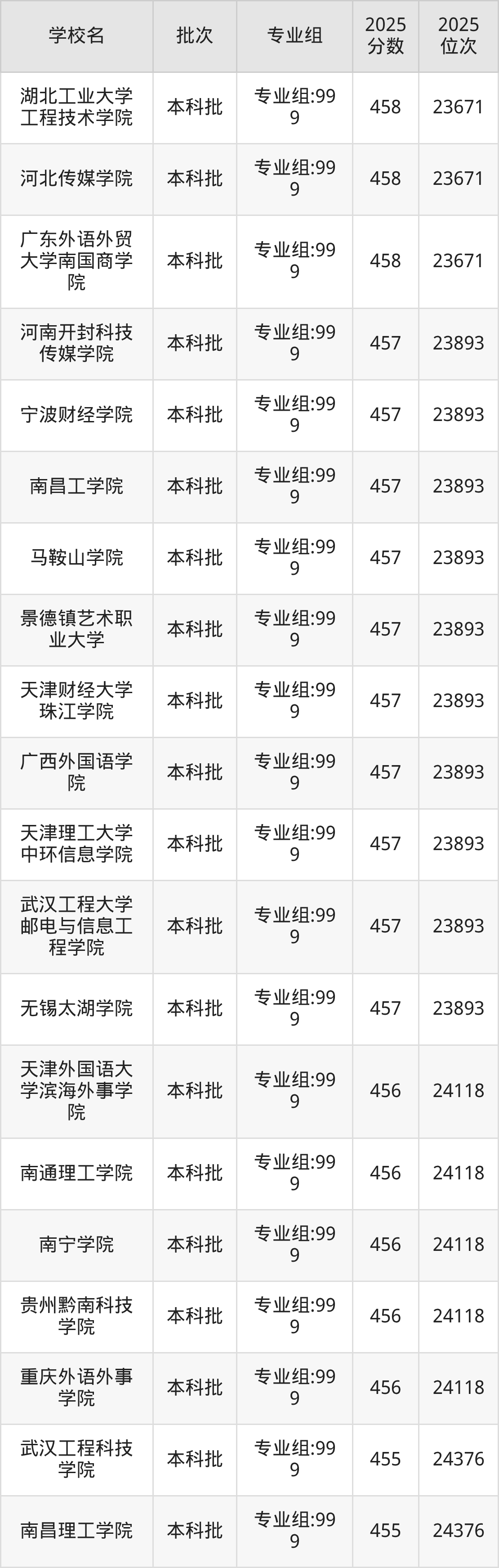 2025年福建高考历史类457分(23672名~23893名)能上的大学有广西外国语学院专业组:999、河南开封科技传媒学院专业组:999、景德镇艺术职业大学专业组:999、马鞍山学院专业组:999等。