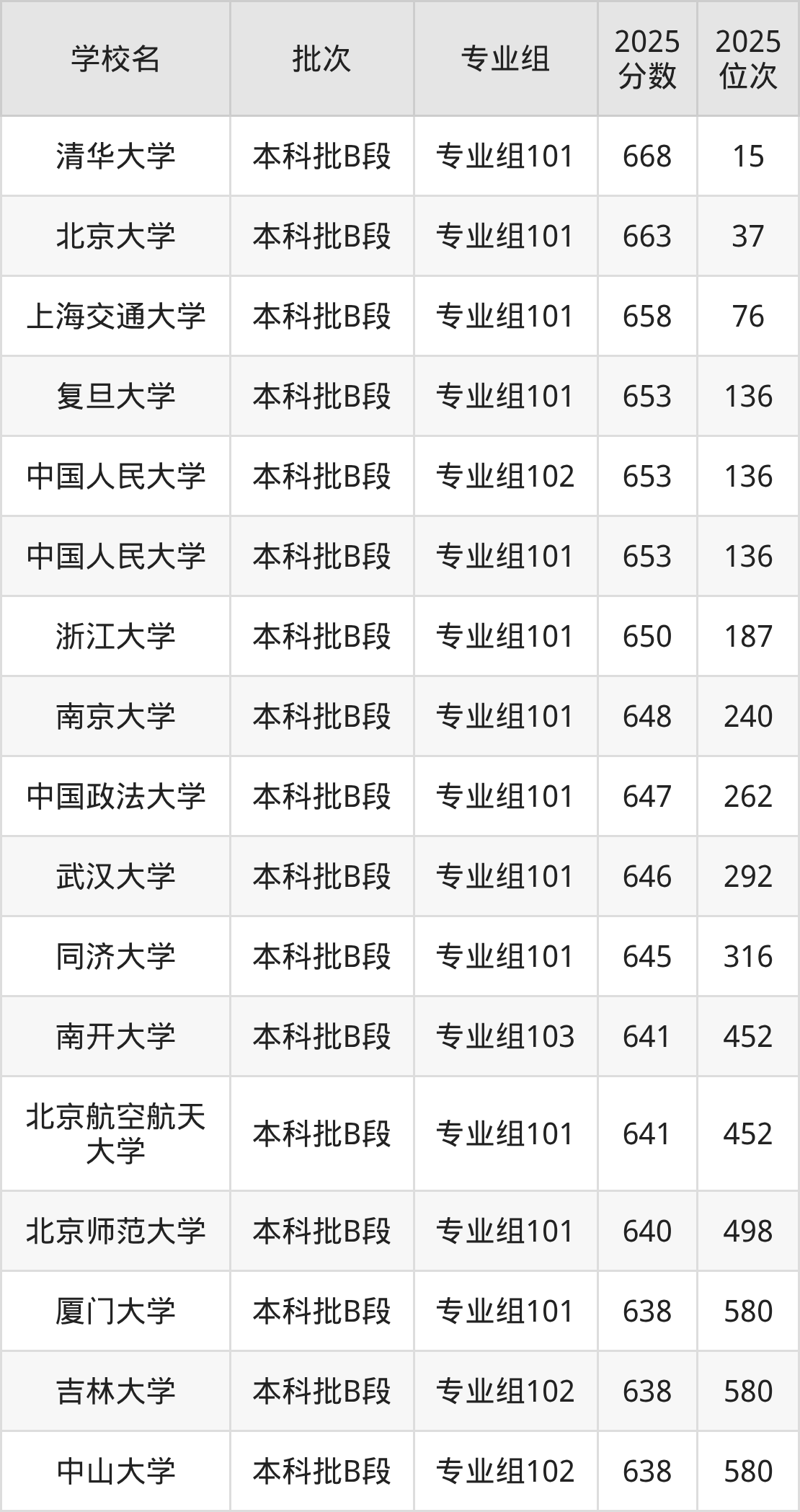 2025年四川高考历史类655分(93名~105名)录取位次低于该区间(较稳妥)的有中国人民大学专业组101(136名)、中国人民大学专业组102(136名)等;录取位次高于该区间(可冲)的有上海交通大学专业组101(76名)、北京大学专业组101(37名)等。