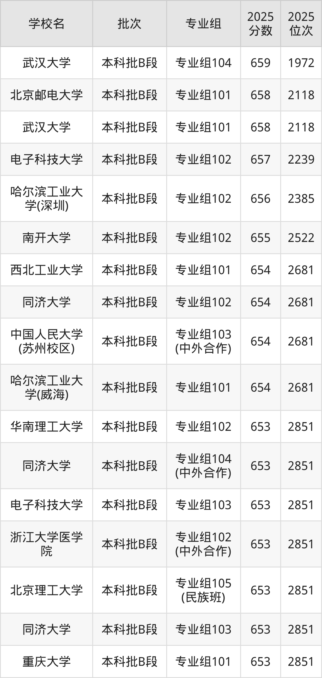 另外录取位次低于该区间(较稳妥)的有哈尔滨工业大学(威海)专业组101(2681名)、中国人民大学(苏州校区)专业组103(中外合作)(2681名)等;录取位次高于该区间(可冲)的有哈尔滨工业大学(深圳)专业组102(2385名)、电子科技大学专业组102(2239名)等。