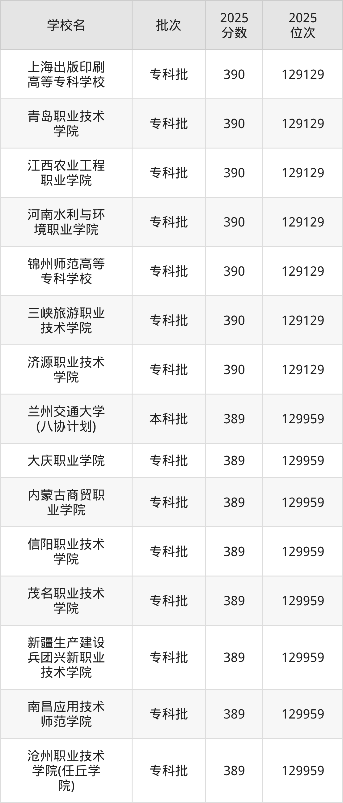 2025年河北高考历史类389分(129130名~129959名)能上的大学有沧州职业技术学院(任丘学院)、南昌应用技术师范学院、新疆生产建设兵团兴新职业技术学院、茂名职业技术学院等。