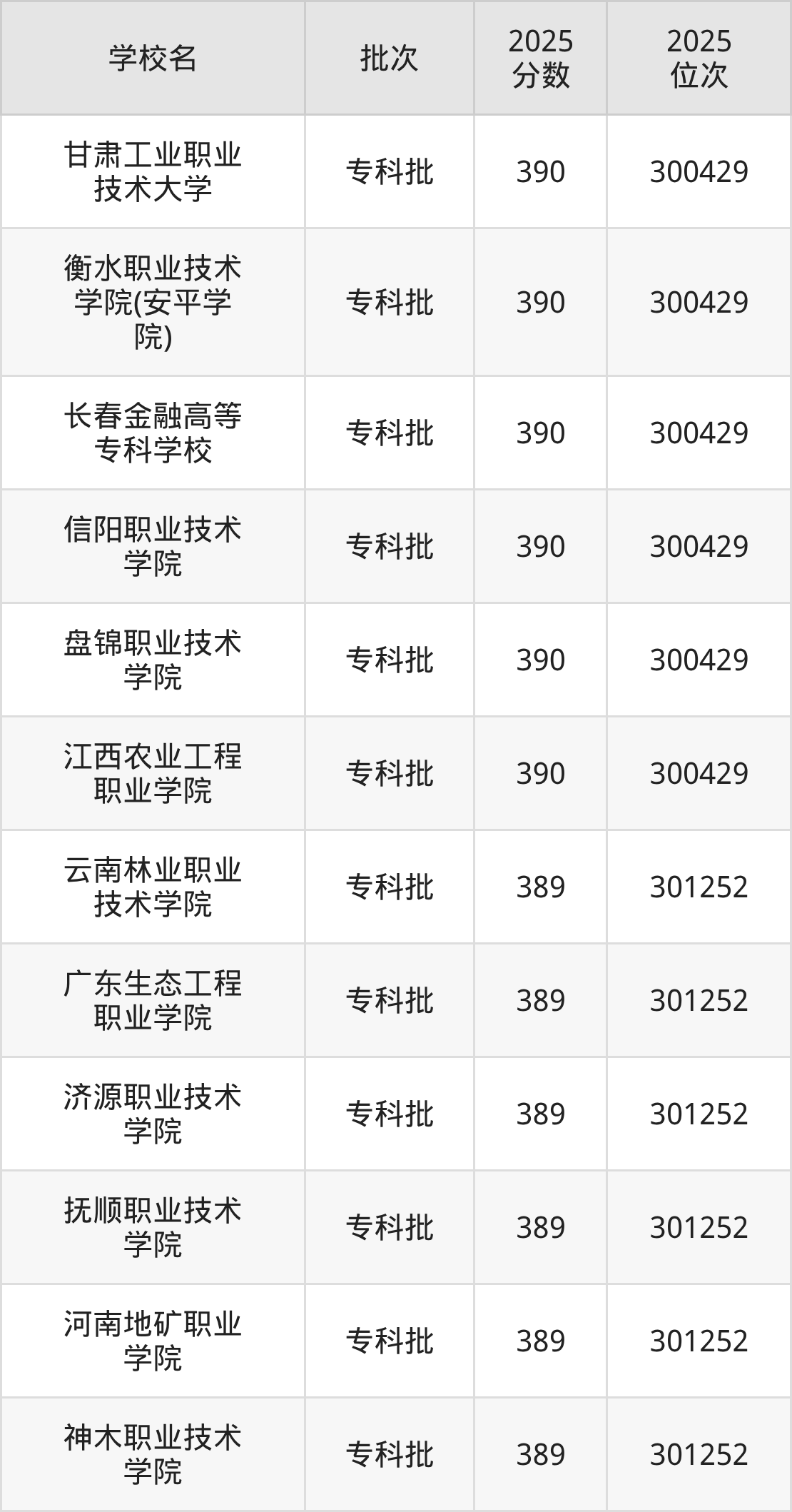 2025年河北高考物理类389分(300430名~301252名)能上的大学有抚顺职业技术学院、河南地矿职业学院、云南林业职业技术学院、神木职业技术学院等。