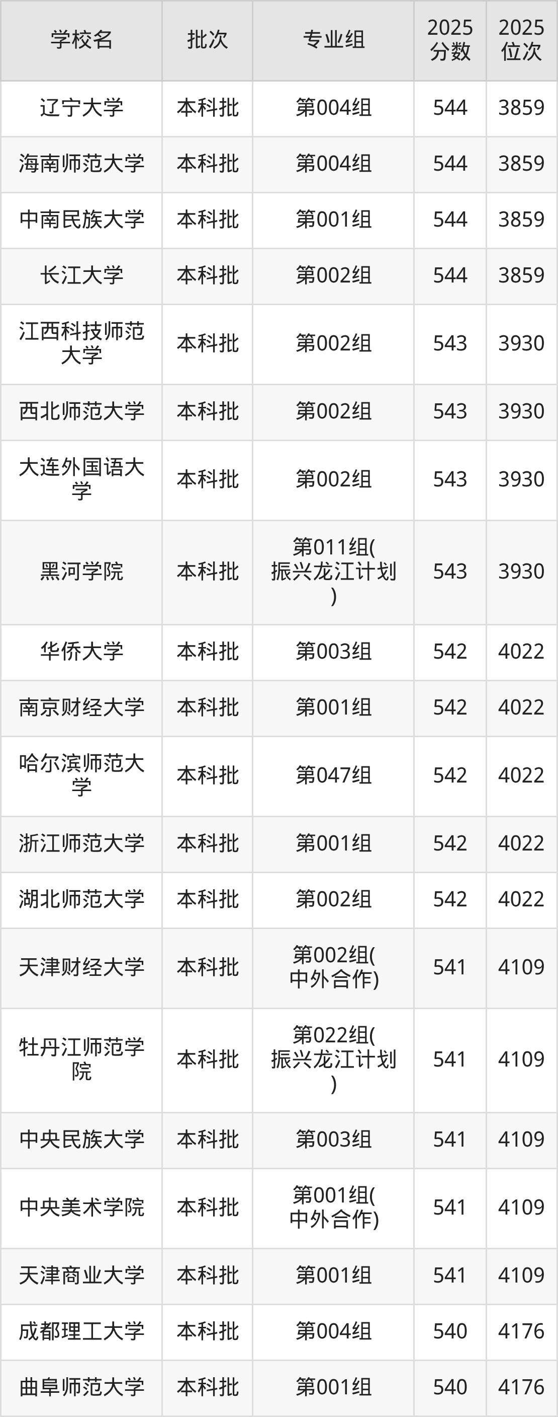 2025年黑龙江高考历史类541分(4023名~4109名)能上的大学有中央民族大学第003组、中央美术学院第001组(中外合作)、天津商业大学第001组、天津财经大学第002组(中外合作)等。