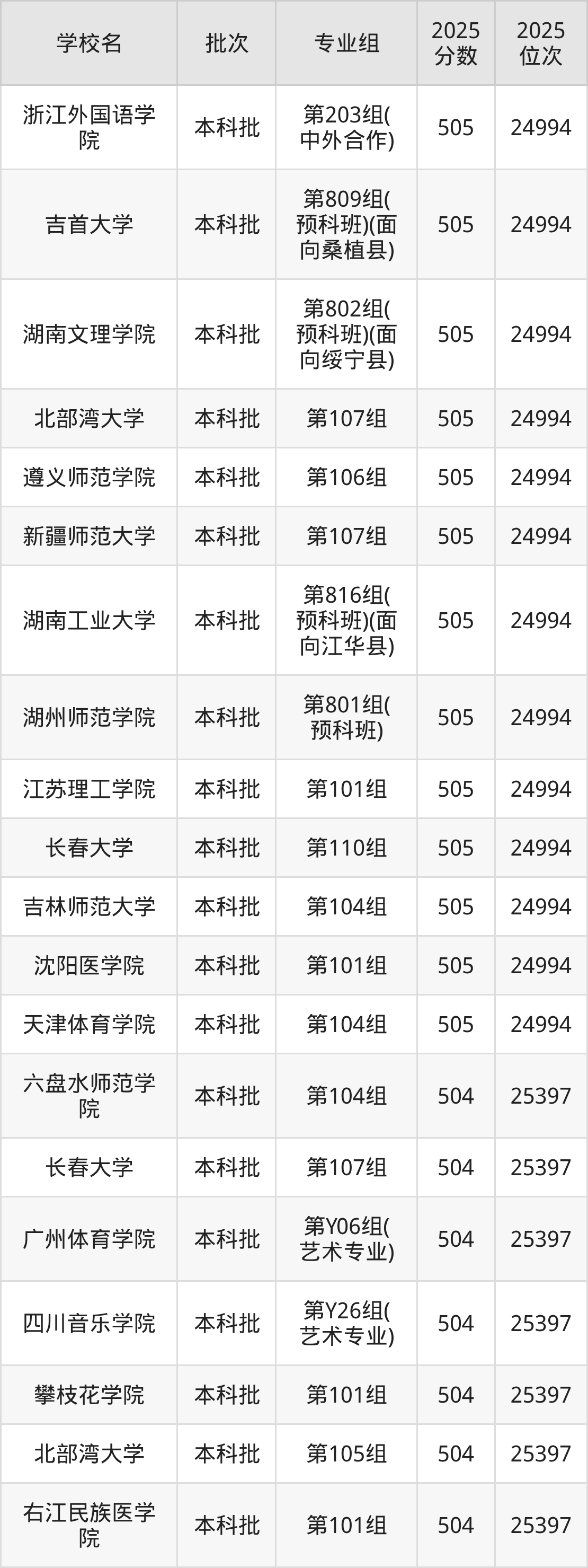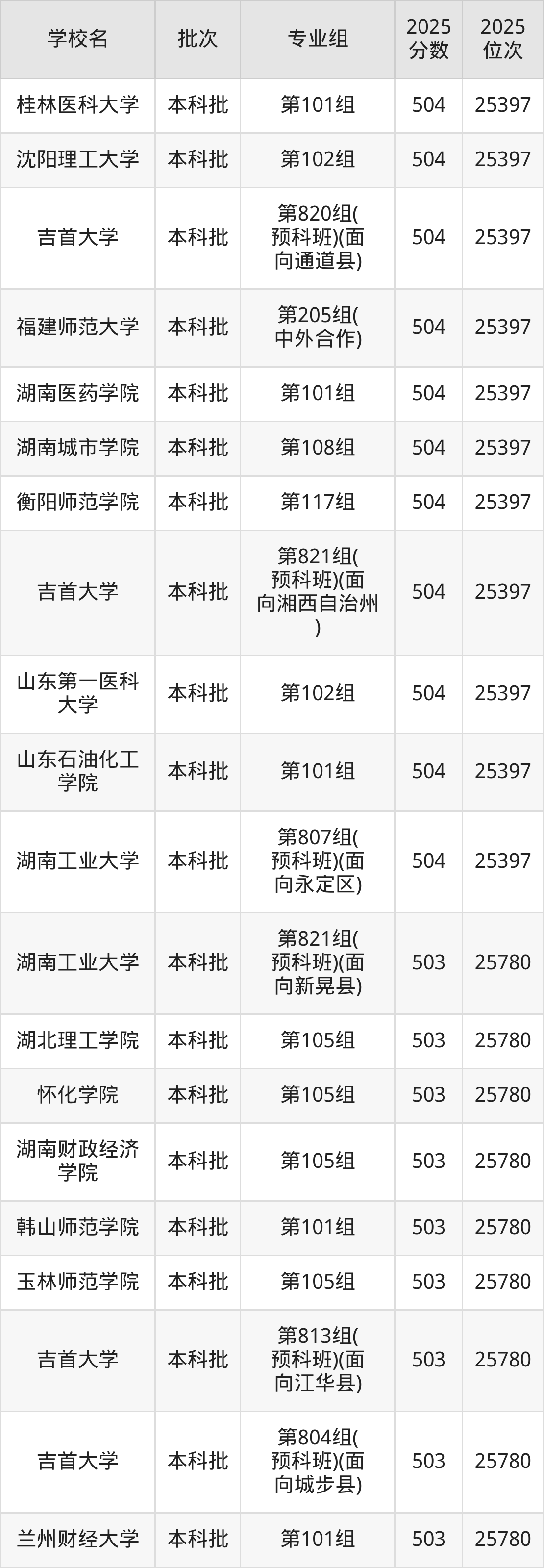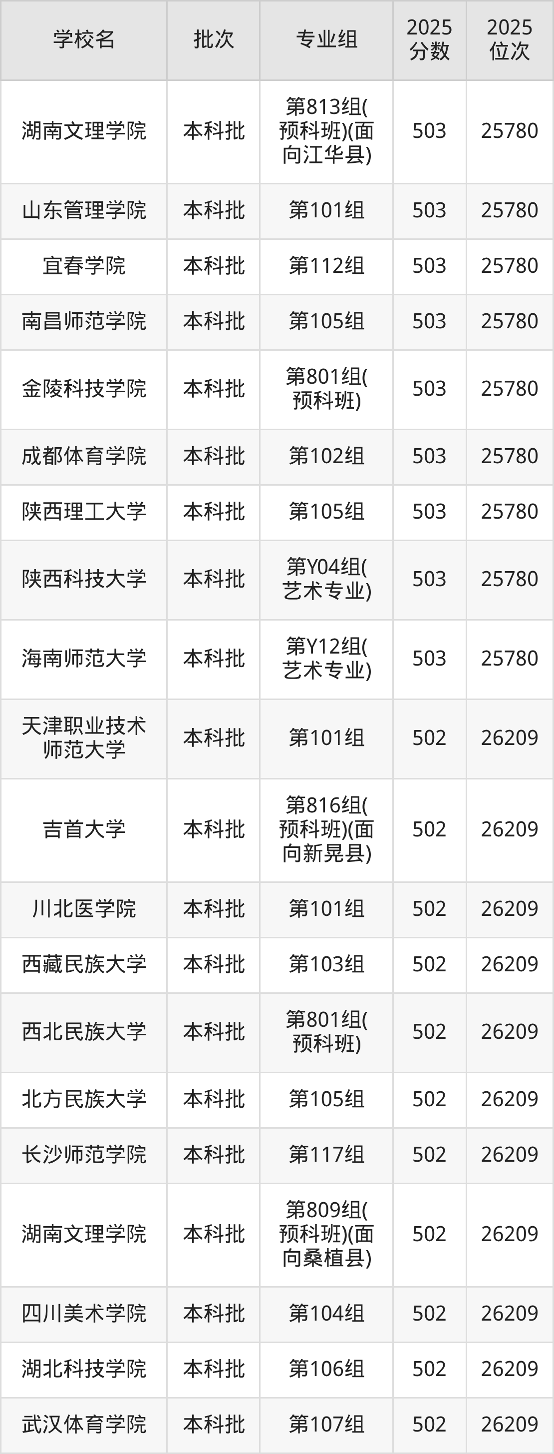 2025年湖南高考历史类503分(25398名~25780名)能上的大学有金陵科技学院第801组(预科班)、南昌师范学院第105组、宜春学院第112组、山东管理学院第101组等。