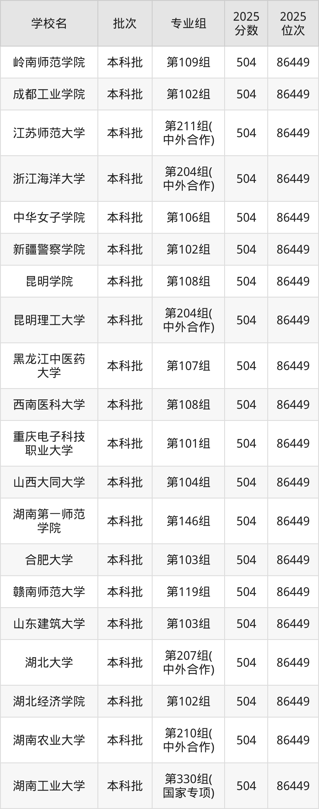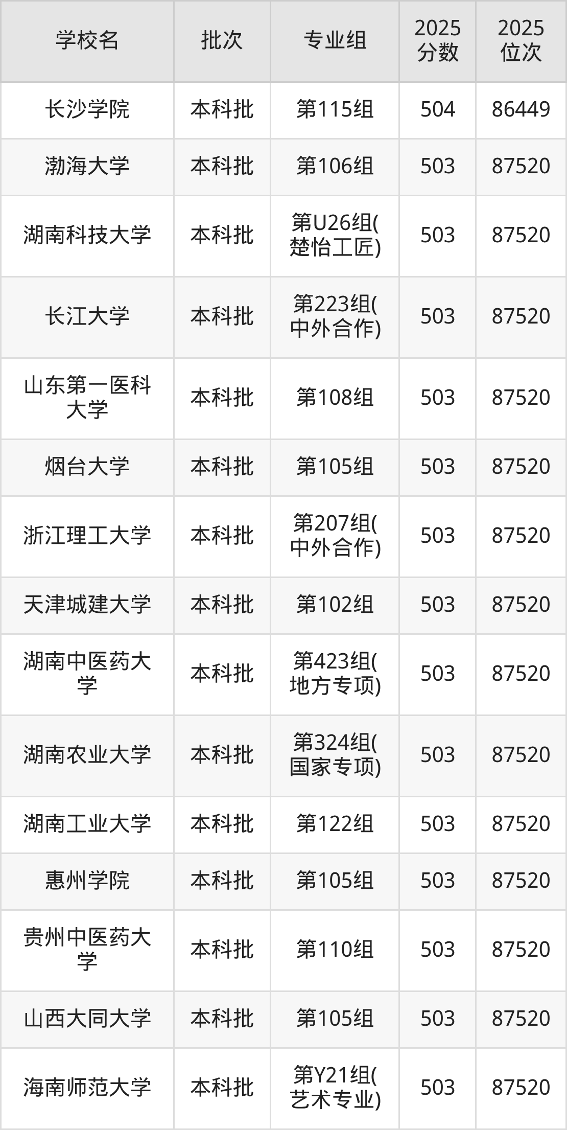 2025年湖南高考物理类503分(86450名~87520名)能上的大学有天津城建大学第102组、山西大同大学第105组、渤海大学第106组、浙江理工大学第207组(中外合作)等。