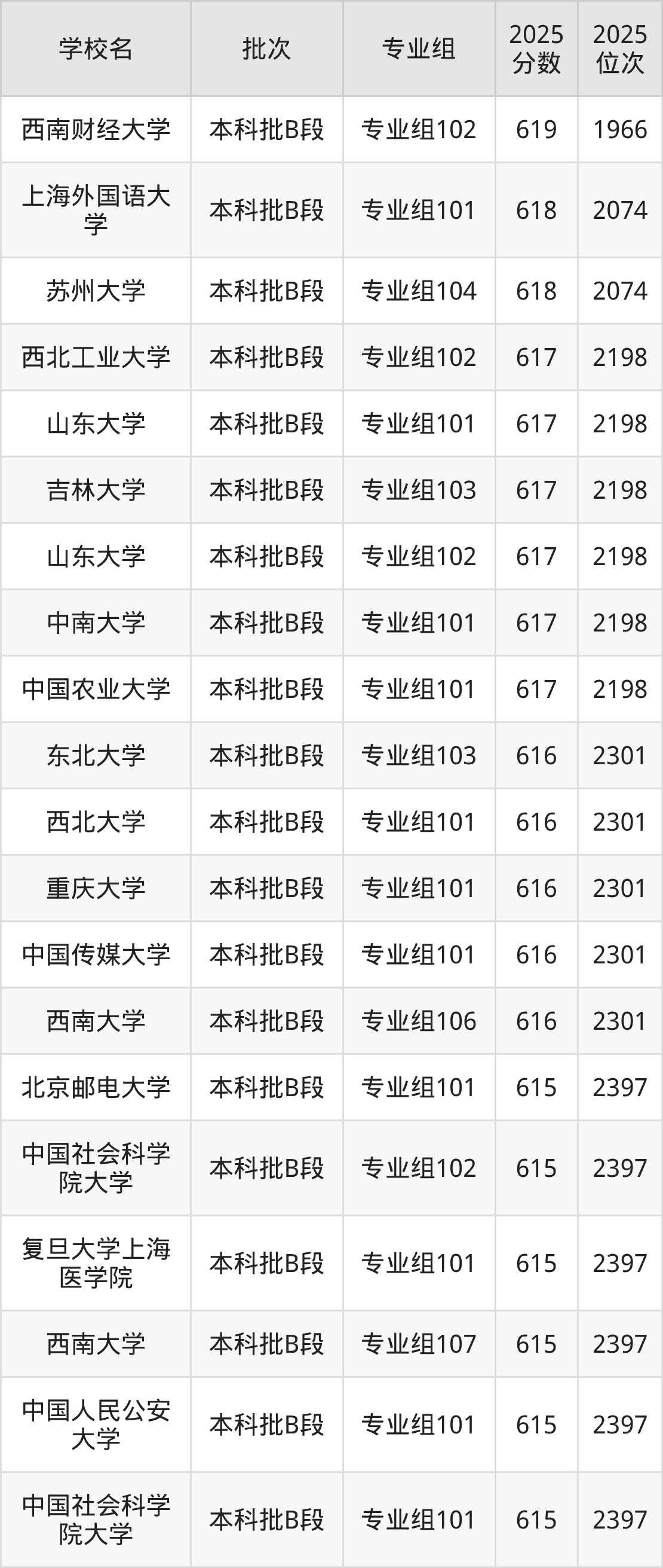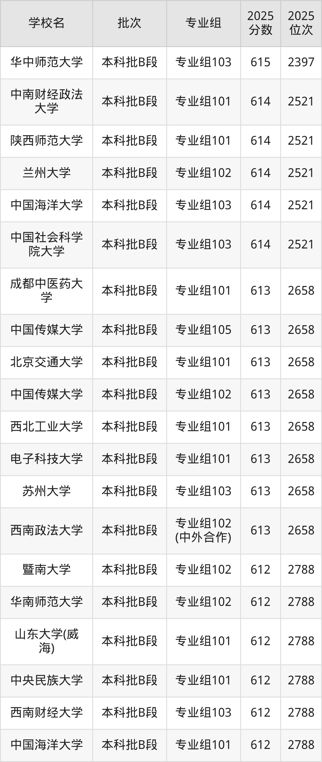 2025年四川高考历史类614分(2398名~2521名)能上的大学有中国社会科学院大学专业组103、中南财经政法大学专业组101、中国海洋大学专业组103、陕西师范大学专业组101等。