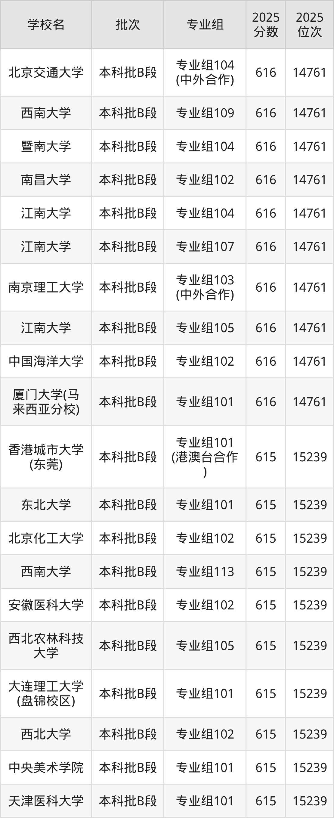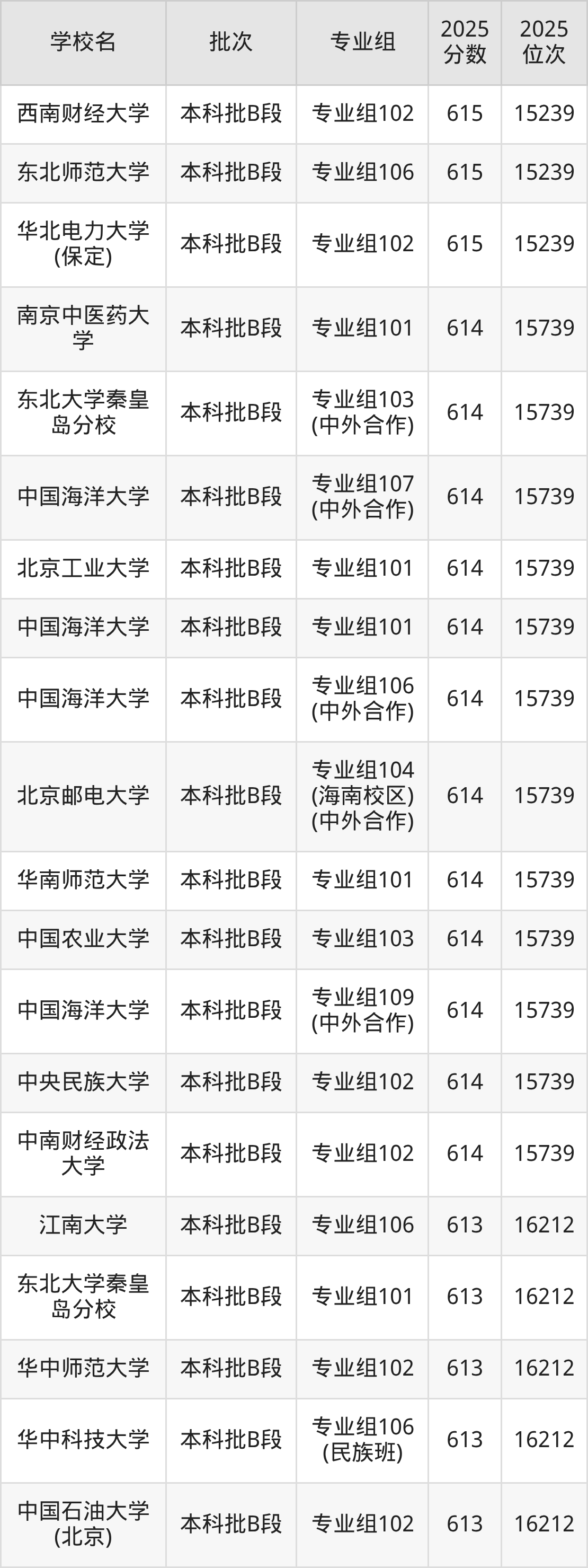 2025年四川高考物理类614分(15240名~15739名)能上的大学有华南师范大学专业组101、中国农业大学专业组103、中国海洋大学专业组109(中外合作)、中央民族大学专业组102等。