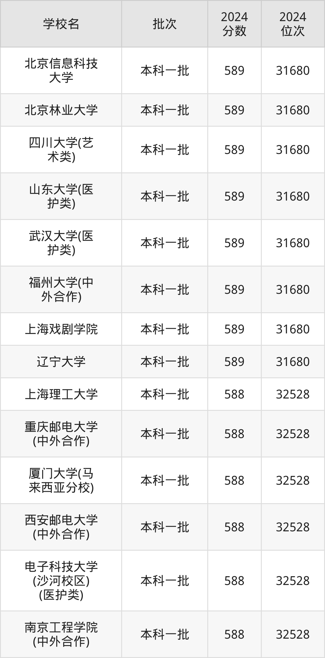 2024年河南高考理科588分(31681名~32528名)能上的大学有上海理工大学、重庆邮电大学(中外合作)、厦门大学(马来西亚分校)、西安邮电大学(中外合作)等。