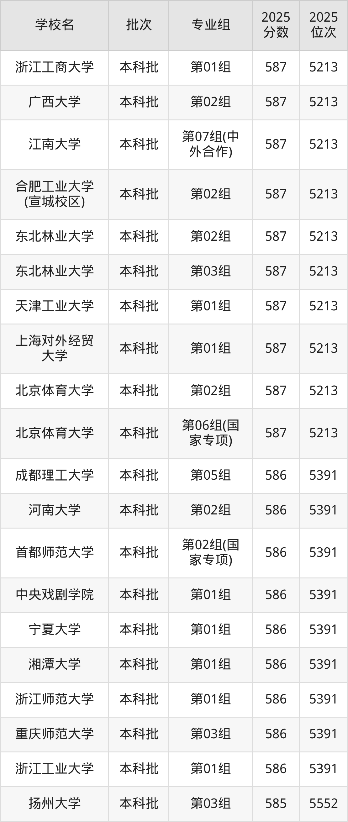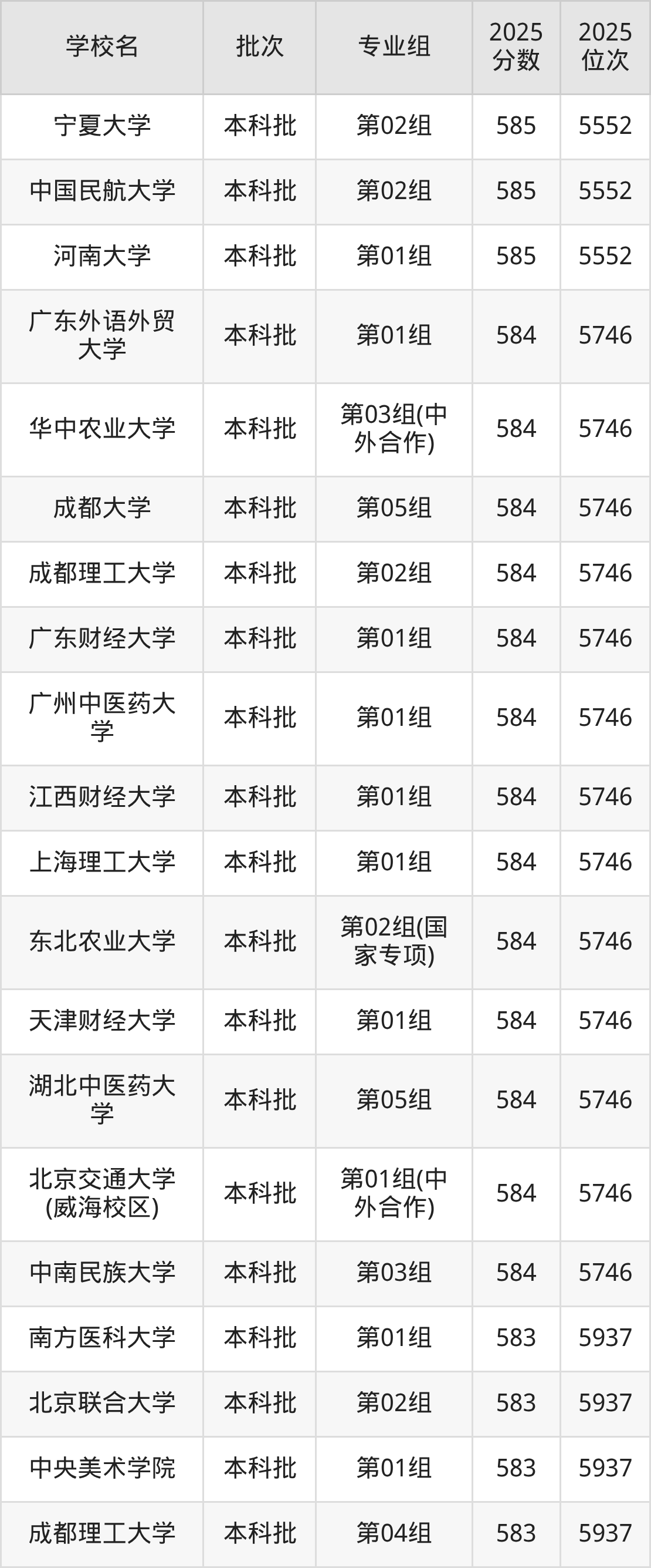 2025年湖北高考历史类585分(5392名~5552名)能上的大学有中国民航大学第02组、扬州大学第03组、河南大学第01组、宁夏大学第02组。