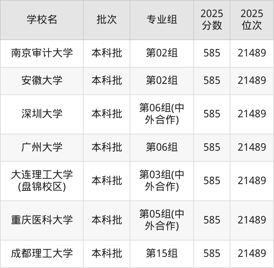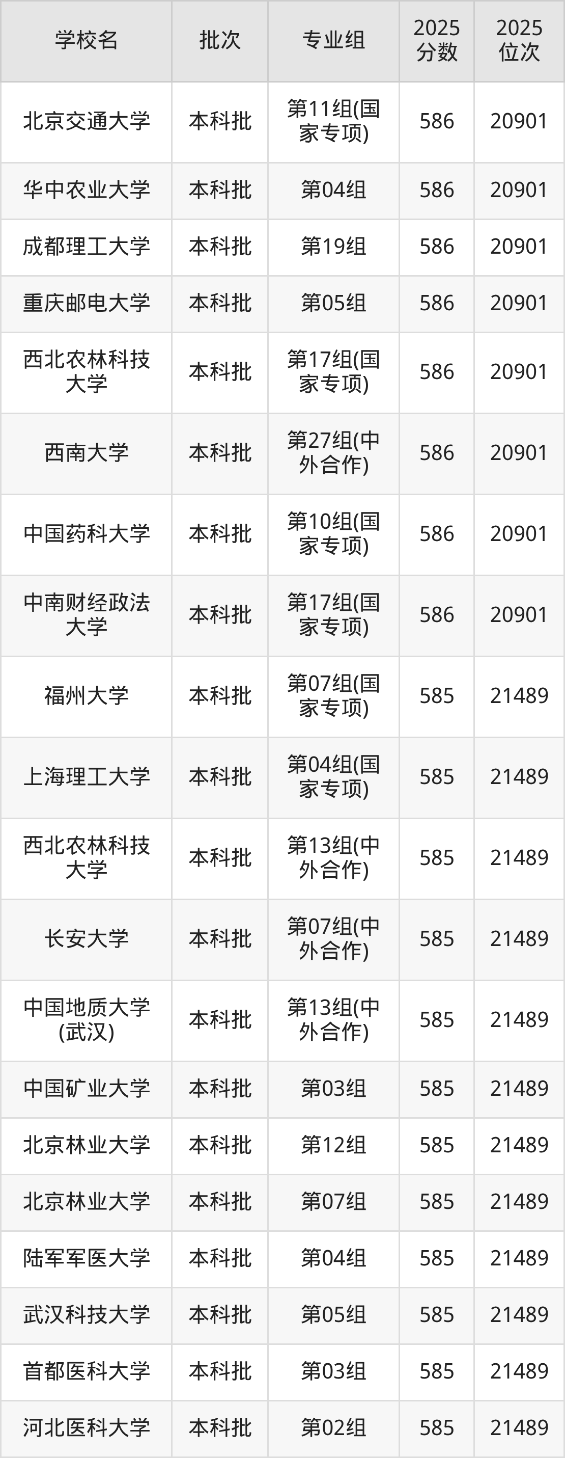 2025年湖北高考物理类585分(20902名~21489名)能上的大学有北京林业大学第07组、北京林业大学第12组、中国矿业大学第03组、中国地质大学(武汉)第13组(中外合作)等。