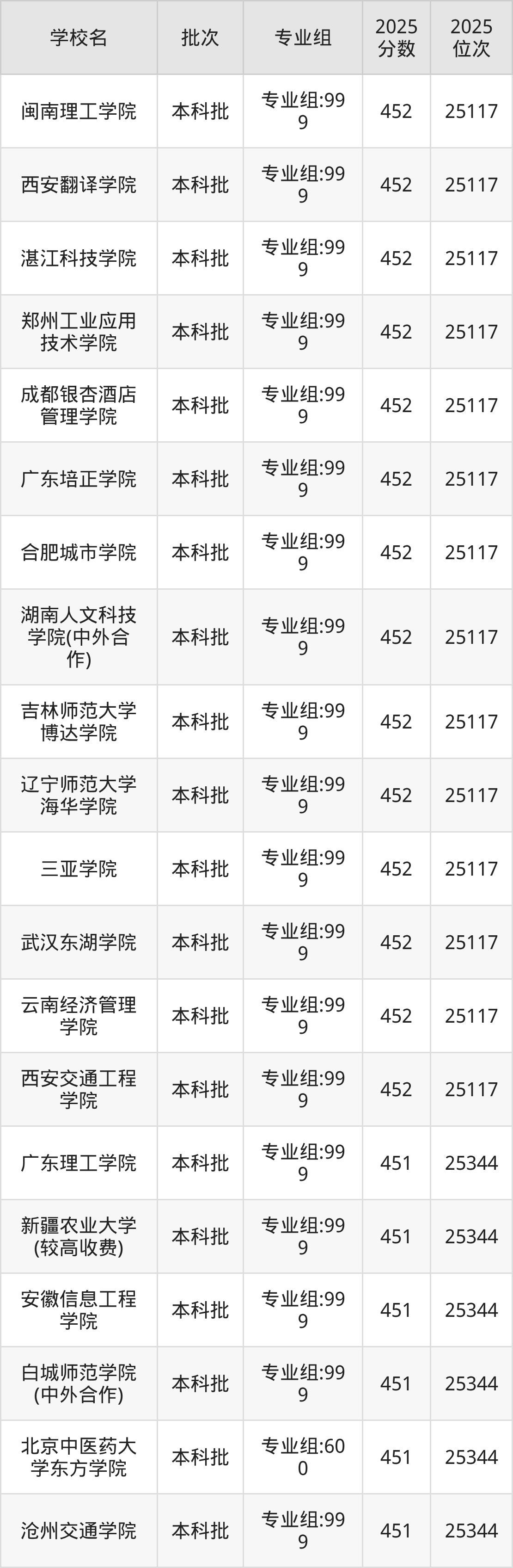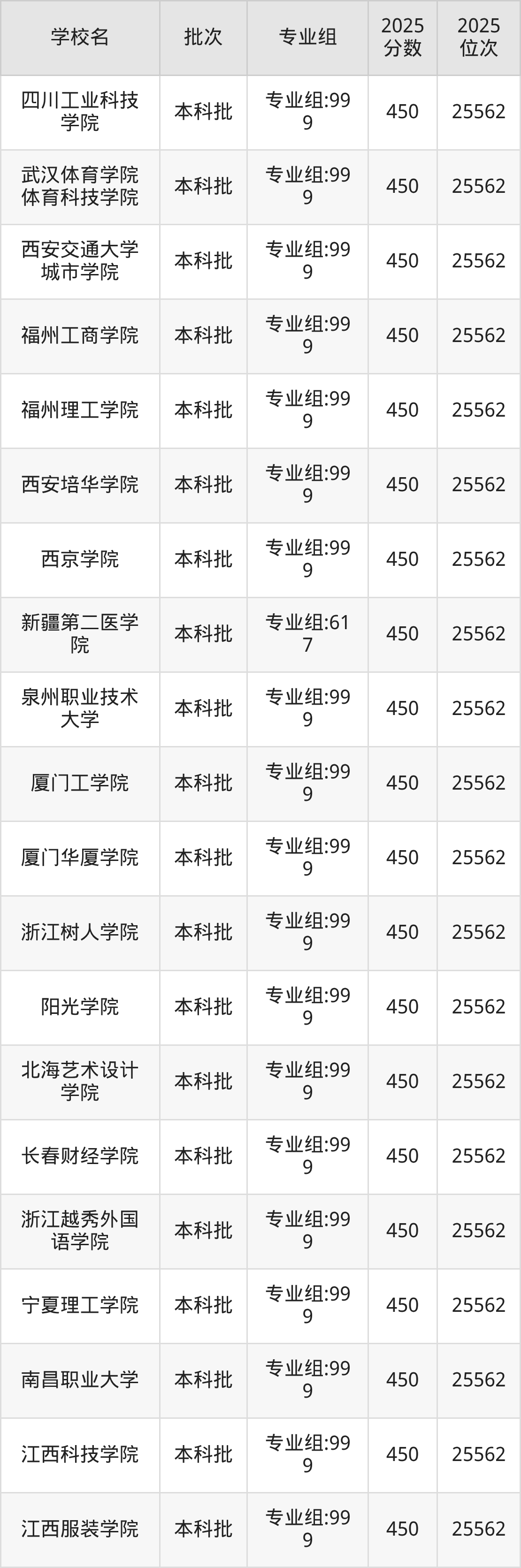 2025年福建高考历史类449分(25563名~25789名)录取位次高于该区间(可冲)的有泉州职业技术大学专业组:999(25562名)、三江学院专业组:999(25562名)等。