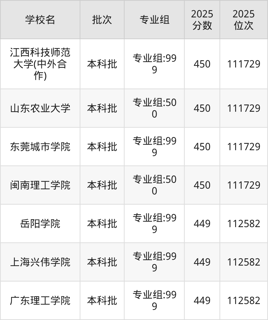 2025年福建高考物理类449分(111730名~112582名)能上的大学有广东理工学院专业组:999、上海兴伟学院专业组:999、岳阳学院专业组:999。