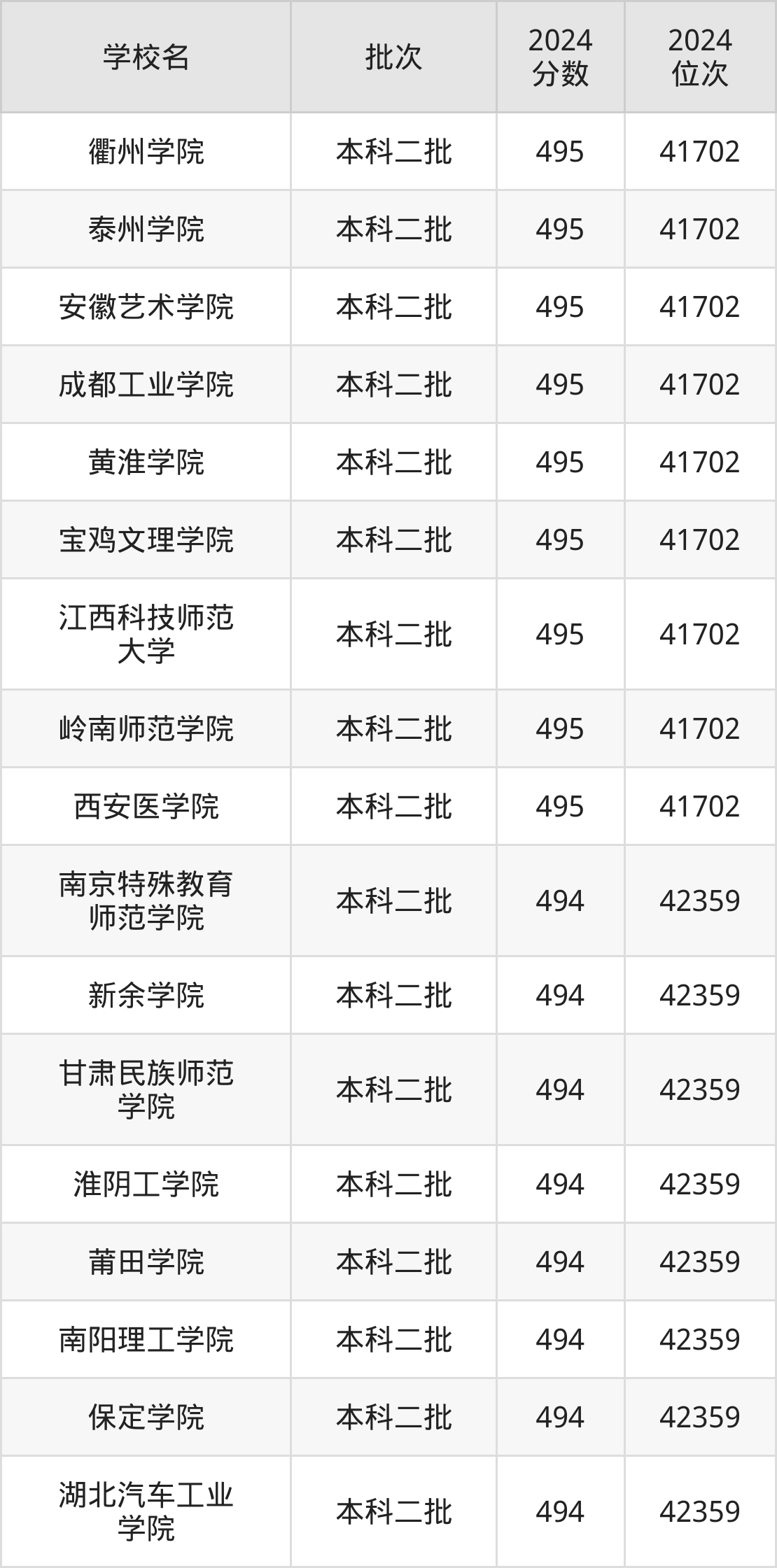 这些都是2025年高考文科41703名~42359名考生可以报考的大学,更多学校名单如下表所示: