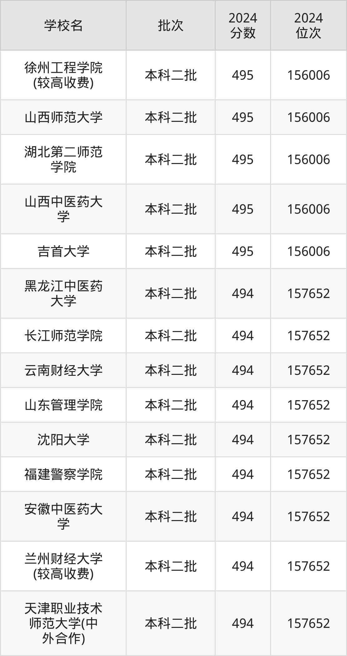这些都是2025年高考理科156007名~157652名考生可以报考的大学,更多学校名单如下表所示:
