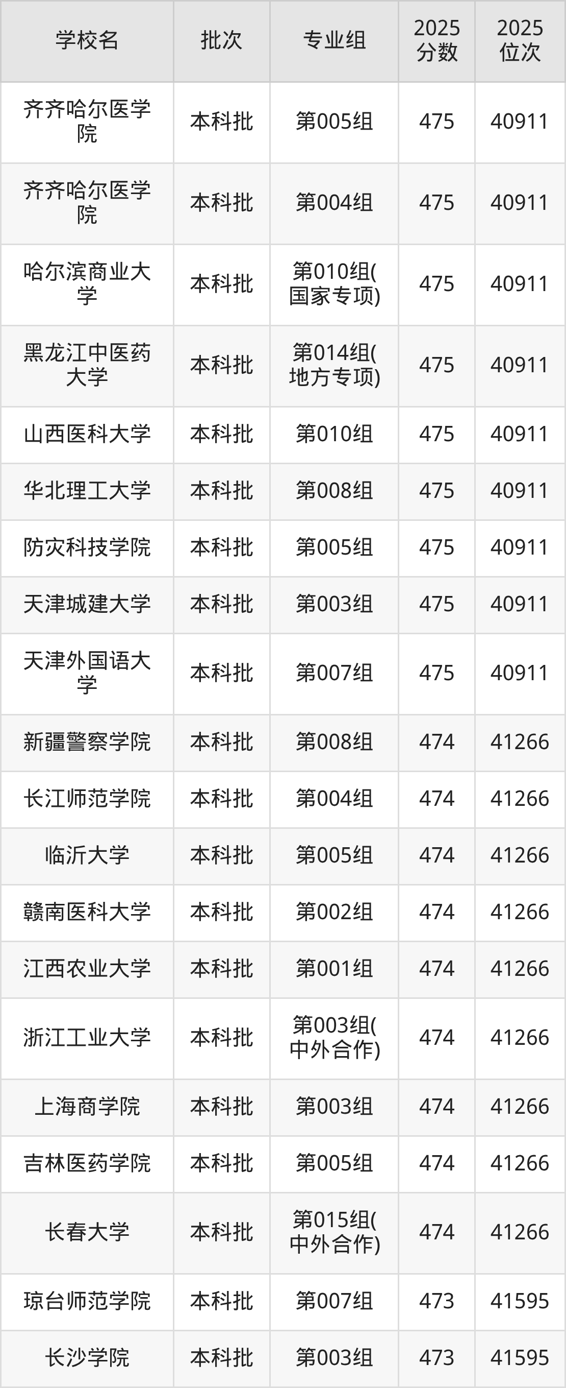 2025年黑龙江高考物理类474分(40912名~41266名)能上的大学有长春大学第015组(中外合作)、吉林医药学院第005组、上海商学院第003组、浙江工业大学第003组(中外合作)等。