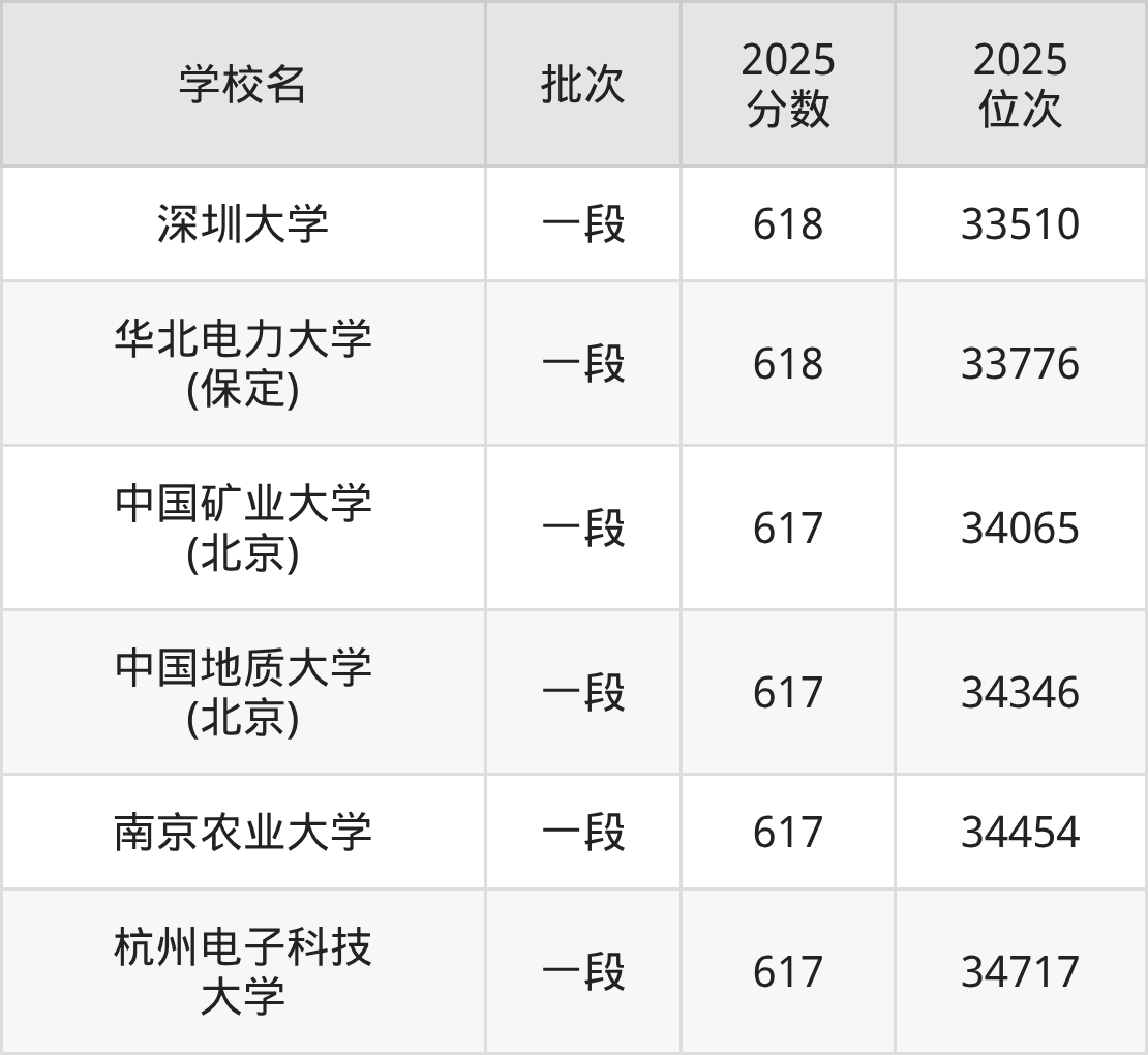 2025年浙江高考617分(33927名~34876名)能上的大学有杭州电子科技大学、南京农业大学、中国地质大学(北京)、中国矿业大学(北京)。