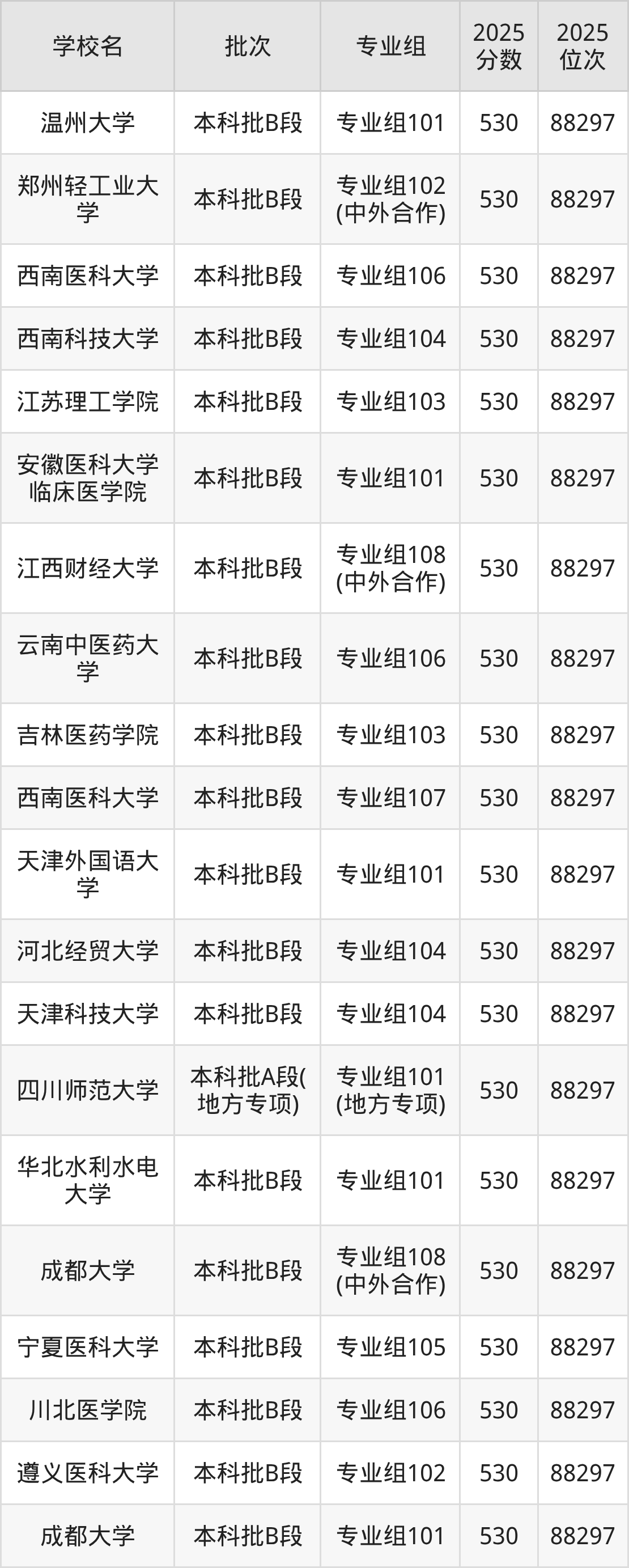 2025年四川高考物理类529分(88298名~89512名)能上的大学有沈阳工业大学专业组104、天津城建大学专业组106、无锡学院专业组101、杭州医学院专业组101等。