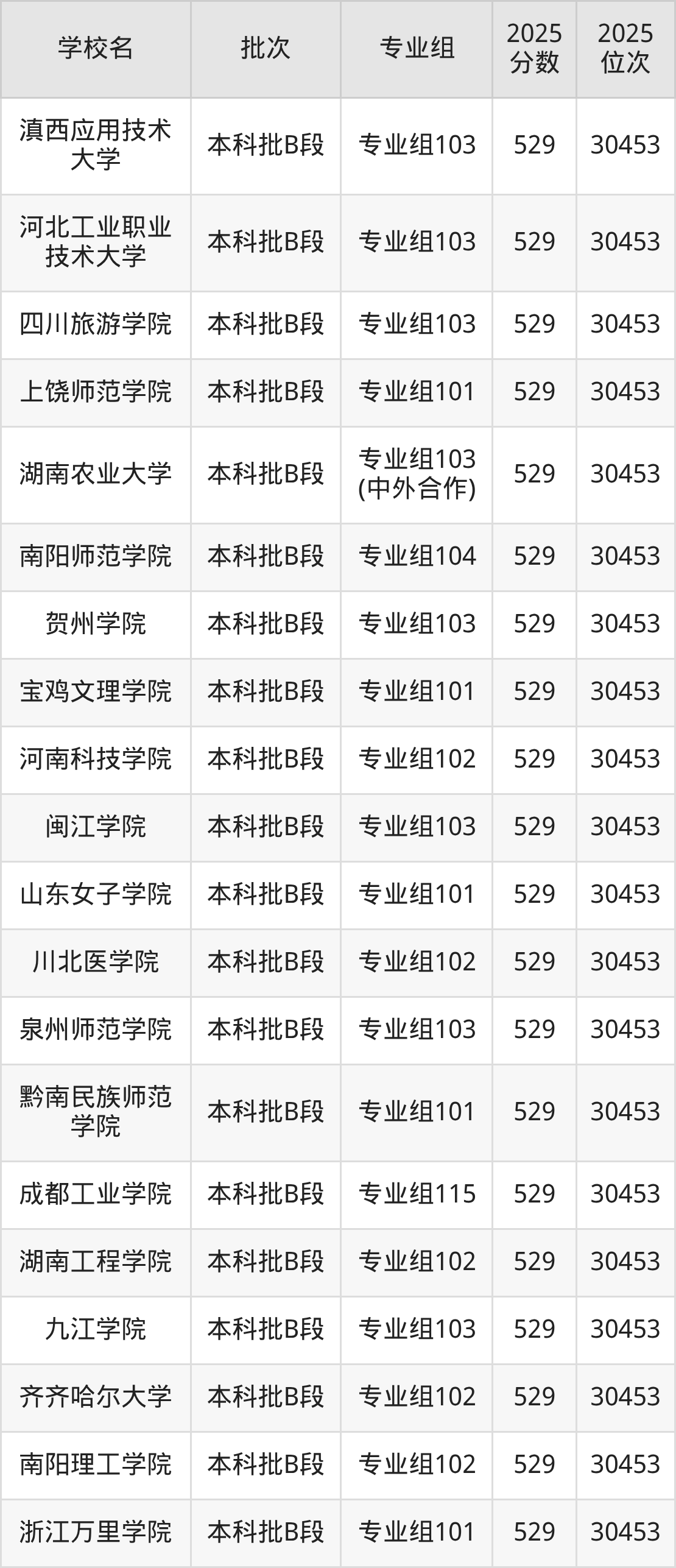 2025年四川高考历史类529分(29872名~30453名)能上的大学有浙江万里学院专业组101、南阳理工学院专业组102、齐齐哈尔大学专业组102、黔南民族师范学院专业组101等。