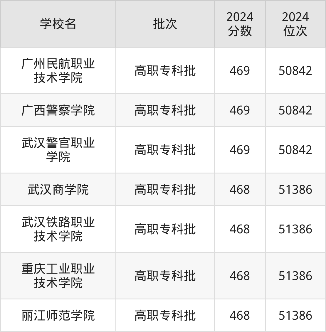 2024年云南高考文科468分(50843名~51386名)能上的大学有武汉商学院、武汉铁路职业技术学院、重庆工业职业技术学院、丽江师范学院。