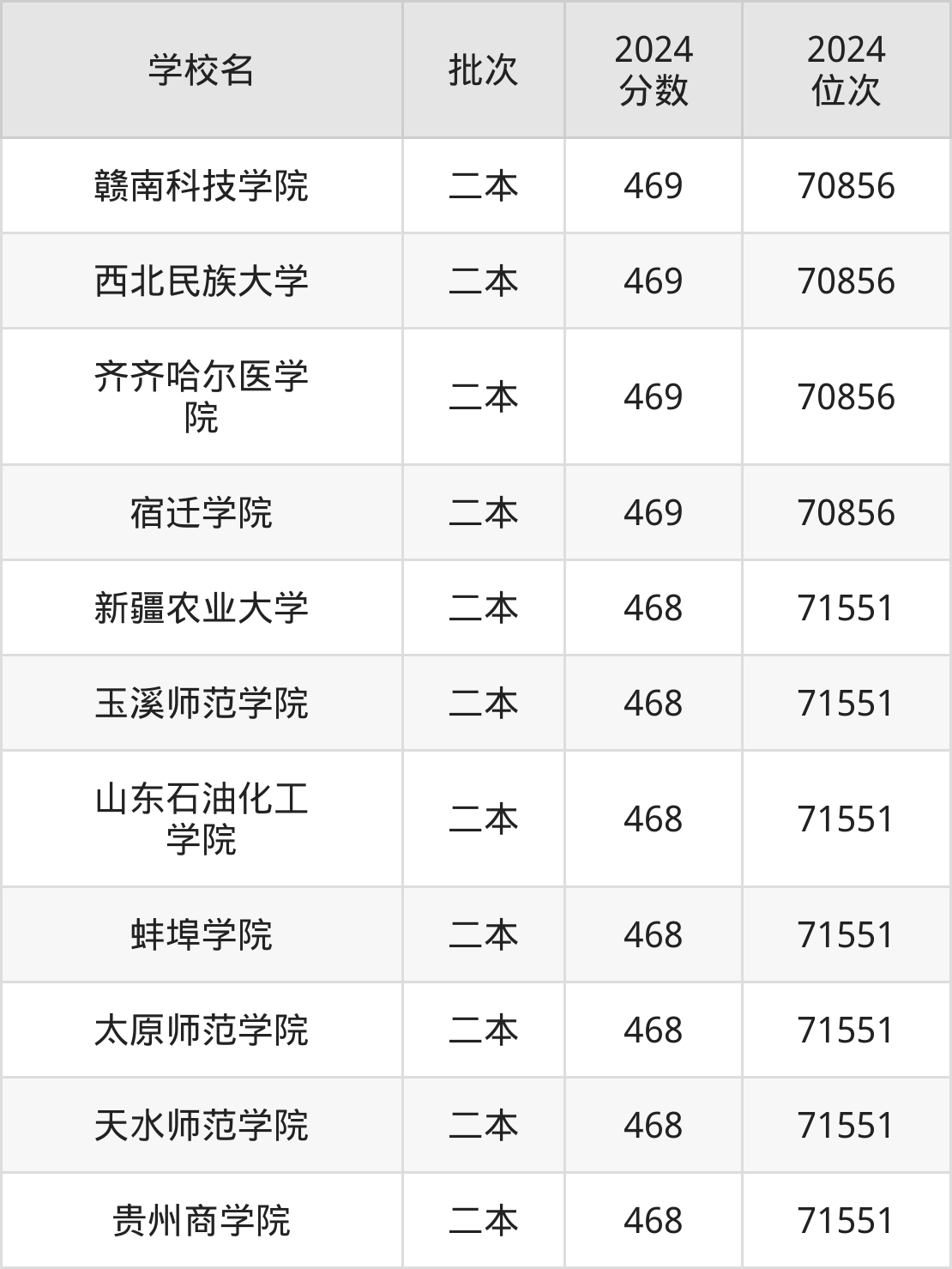 这些都是2025年高考理科70857名~71551名考生可以报考的大学,更多学校名单如下表所示: