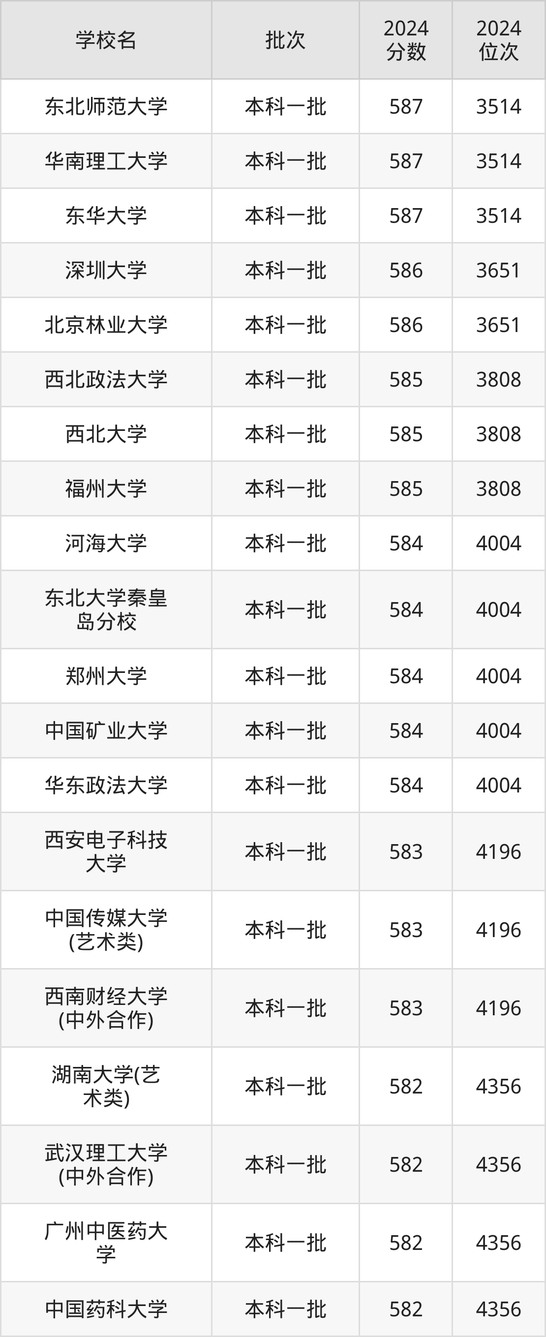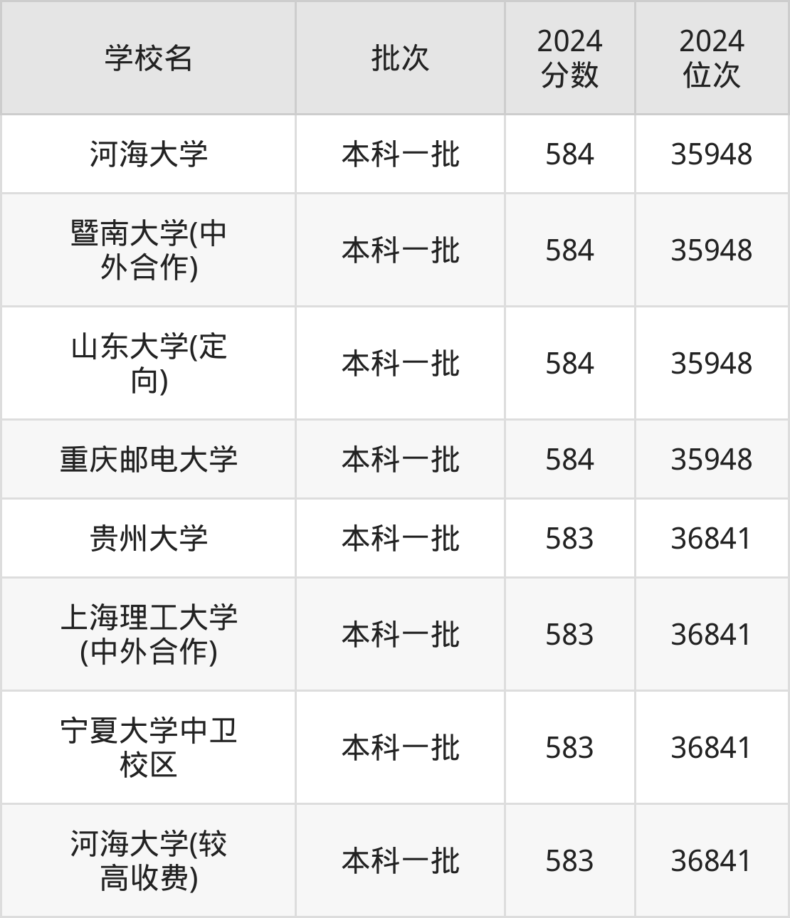 2024年河南高考理科583分(35949名~36841名)能上的大学有贵州大学、上海理工大学(中外合作)、宁夏大学中卫校区、河海大学(较高收费)。