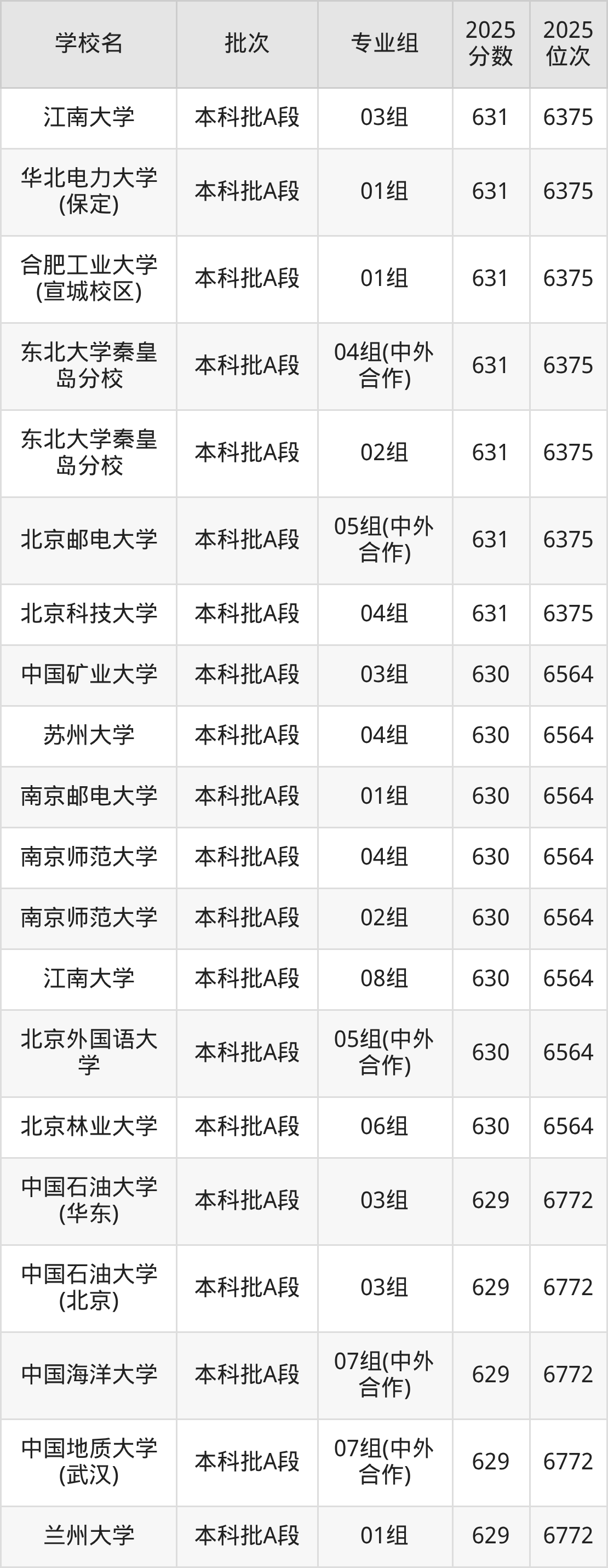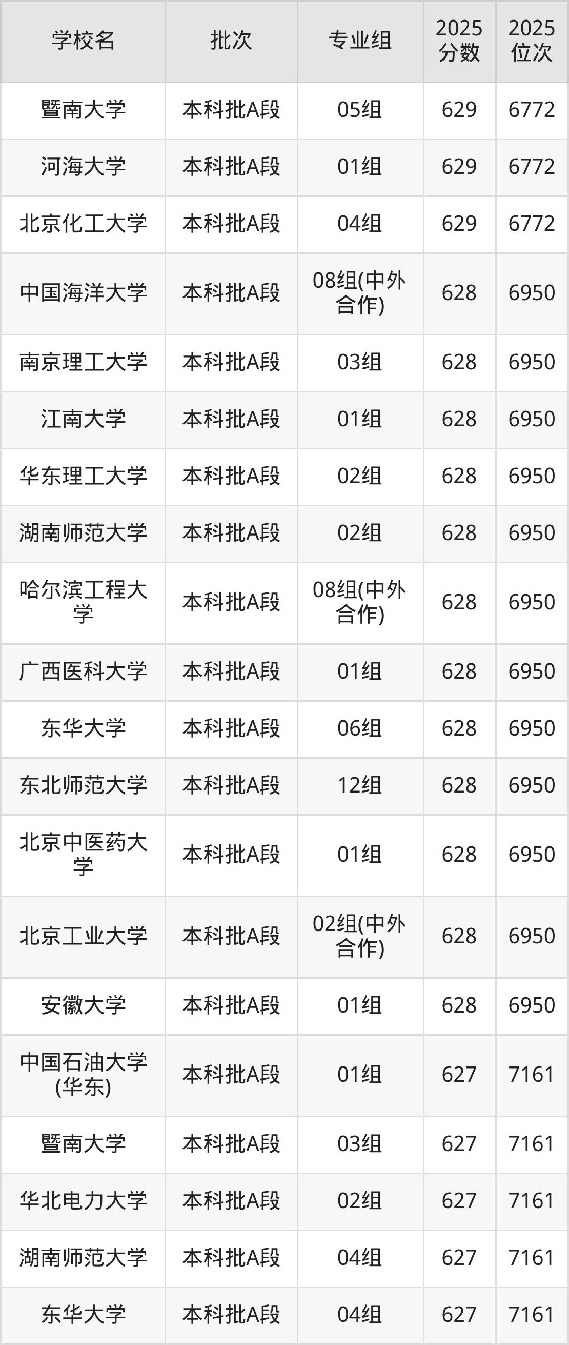 2025年天津高考629分(6565名~6772名)能上的大学有北京化工大学04组、河海大学01组、暨南大学05组、兰州大学01组等。