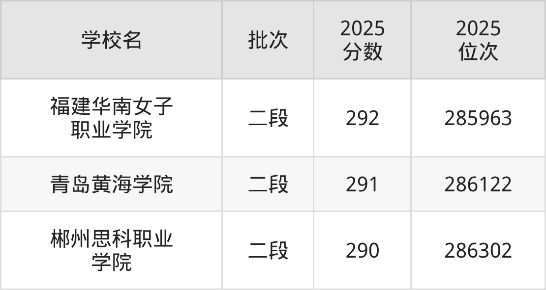 2025年浙江高考289分(286448名~286625名)录取位次低于该区间(较稳妥)的有三亚城市职业学院(287710名)、北京北大方正软件职业技术学院(287916名)等;录取位次高于该区间(可冲)的有郴州思科职业学院(286302名)、青岛黄海学院(286122名)等。