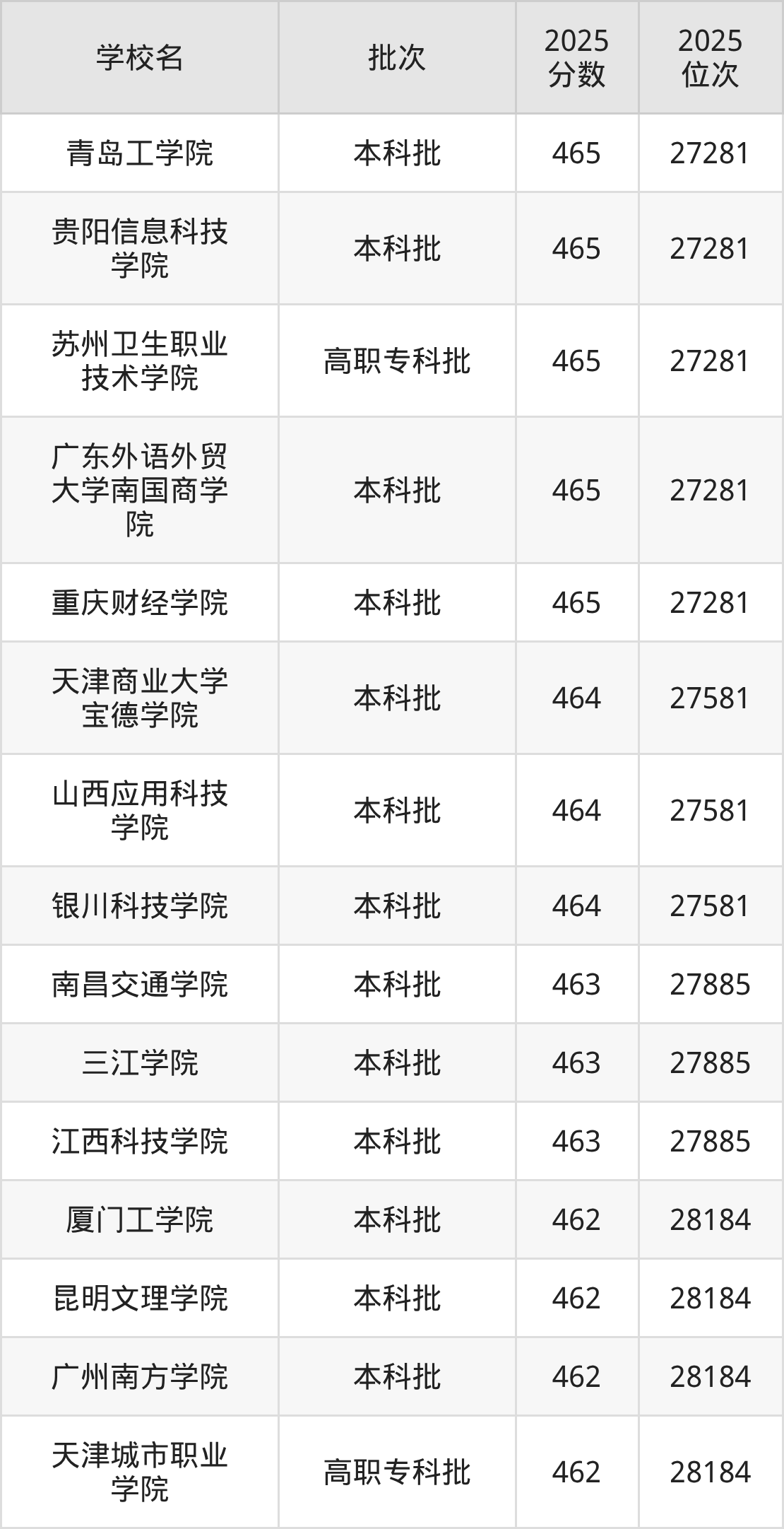 2025年重庆高考历史类463分(27582名~27885名)能上的大学有江西科技学院、三江学院、南昌交通学院。