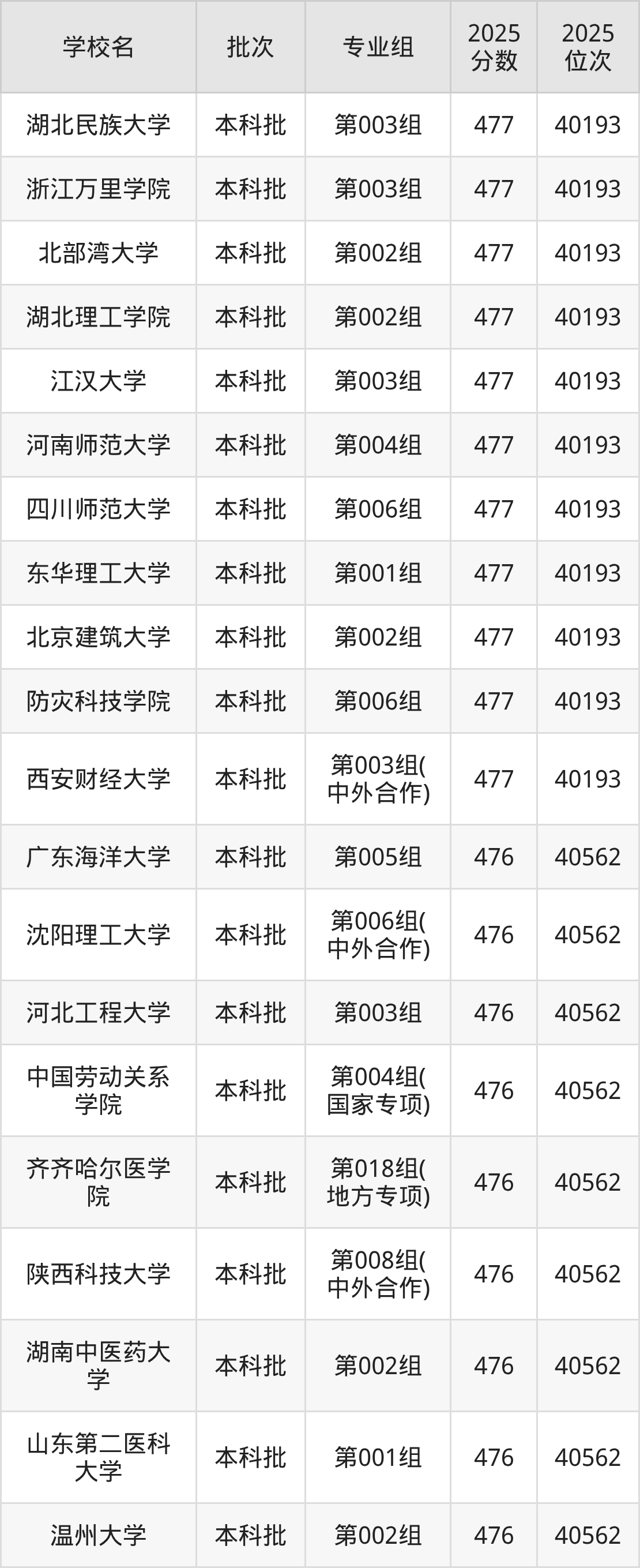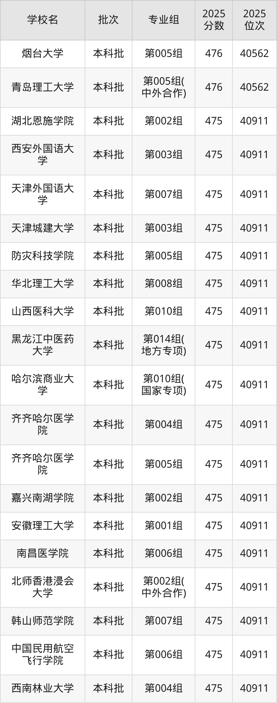 2025年黑龙江高考物理类475分(40563名~40911名)能上的大学有天津外国语大学第007组、天津城建大学第003组、防灾科技学院第005组、华北理工大学第008组等。
