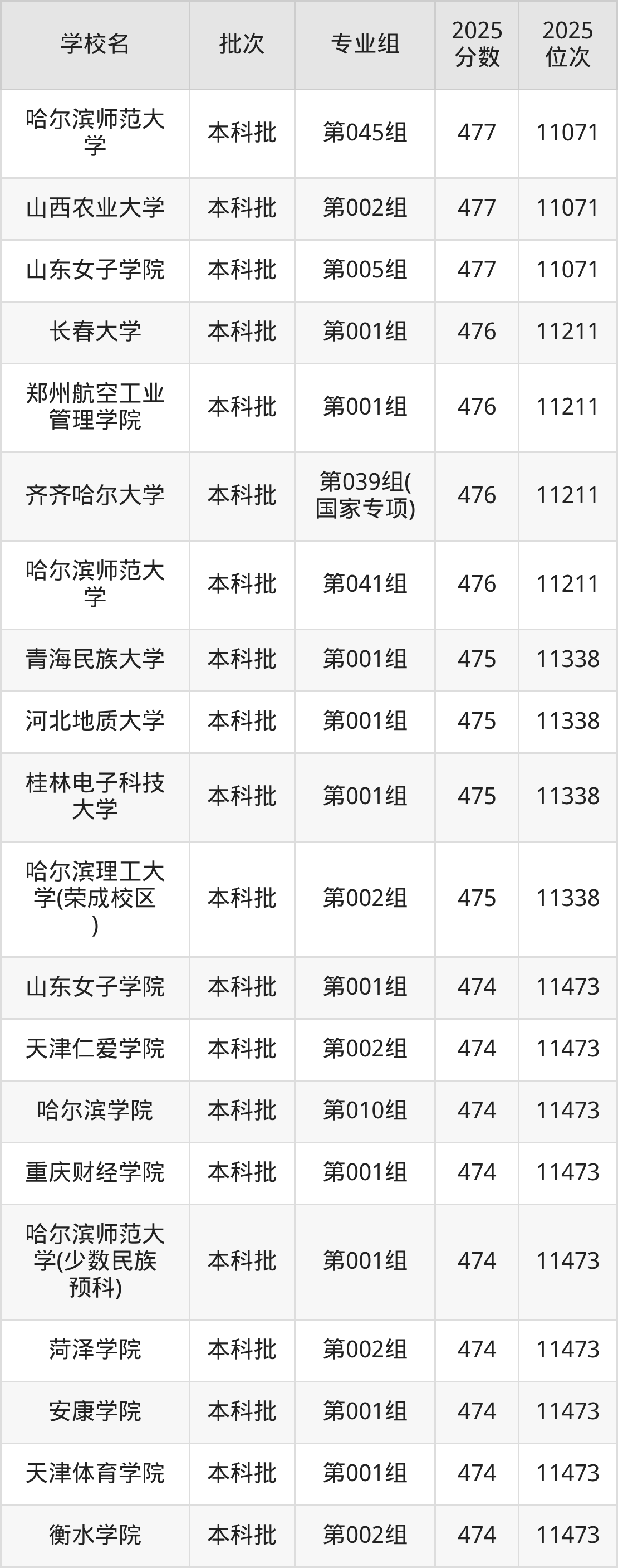 2025年黑龙江高考历史类475分(11212名~11338名)能上的大学有河北地质大学第001组、哈尔滨理工大学(荣成校区)第002组、桂林电子科技大学第001组、青海民族大学第001组。