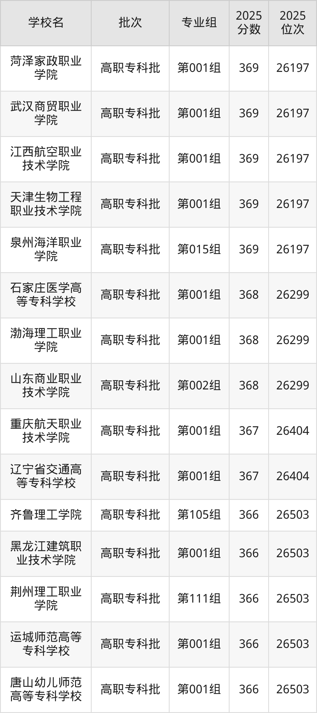 另外录取位次低于该区间(较稳妥)的有吉林电子信息职业技术学院第003组(26105名)、伊春职业学院第001组(26105名)等;录取位次高于该区间(可冲)的有鹤岗师范高等专科学校第002组(25919名)、上海济光职业技术学院第001组(25919名)等。