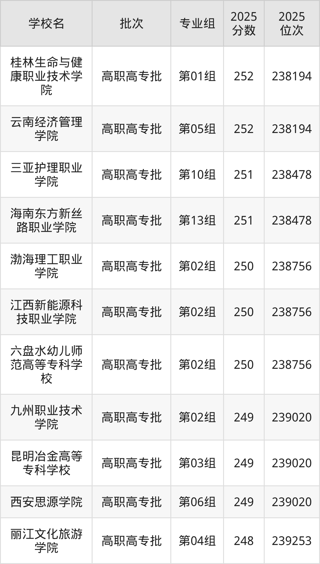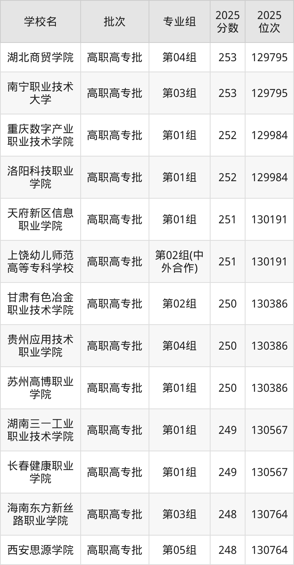 2025年湖北高考历史类250分(130192名~130386名)能上的大学有苏州高博职业学院第01组、贵州应用技术职业学院第04组、甘肃有色冶金职业技术学院第02组。