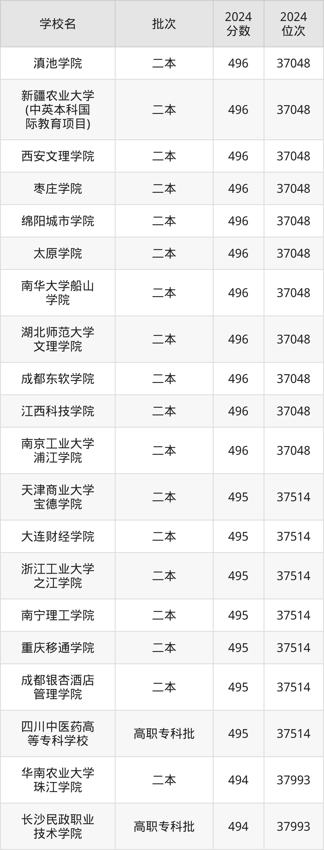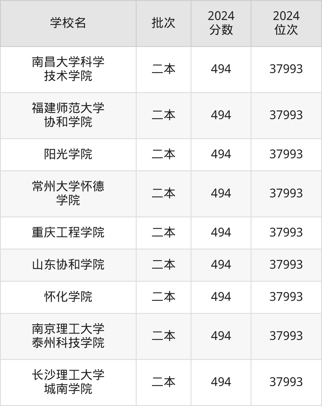 2024年云南高考文科494分(37515名~37993名)能上的大学有南昌大学科学技术学院、长沙理工大学城南学院、南京理工大学泰州科技学院、怀化学院等。