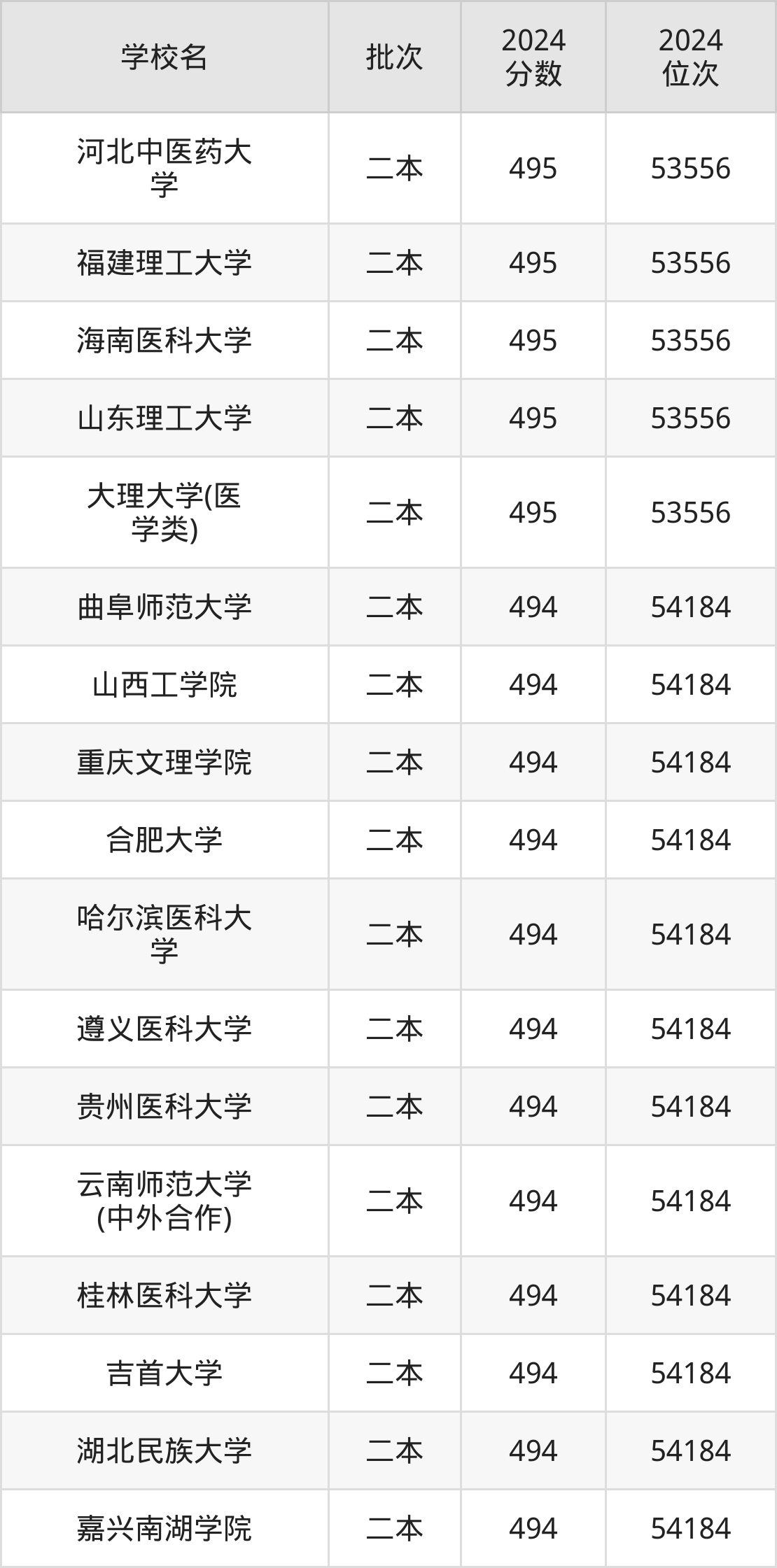 2024年云南高考理科494分(53557名~54184名)能上的大学有吉首大学、桂林医科大学、山西工学院、嘉兴南湖学院等。