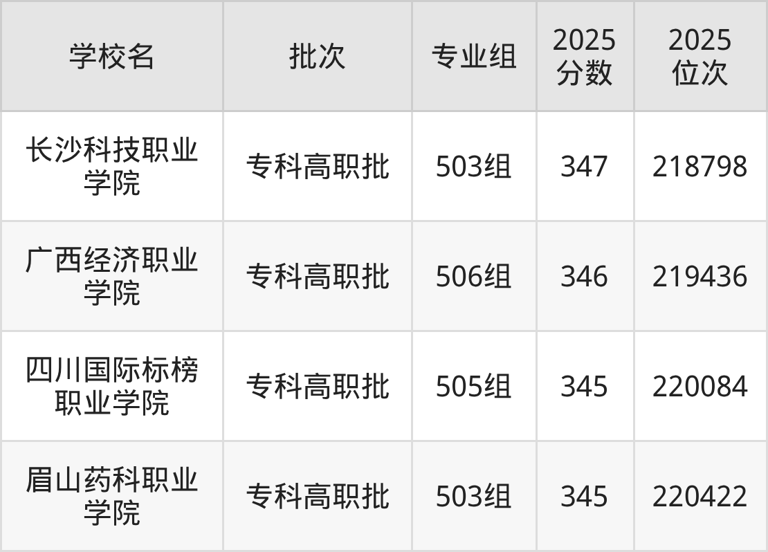另外录取位次低于该区间(较稳妥)的有四川国际标榜职业学院505组(220084名)、眉山药科职业学院503组(220422名)等;录取位次高于该区间(可冲)的有长沙科技职业学院503组(218798名)、私立华联学院508组(校企联合培养)(217860名)等。