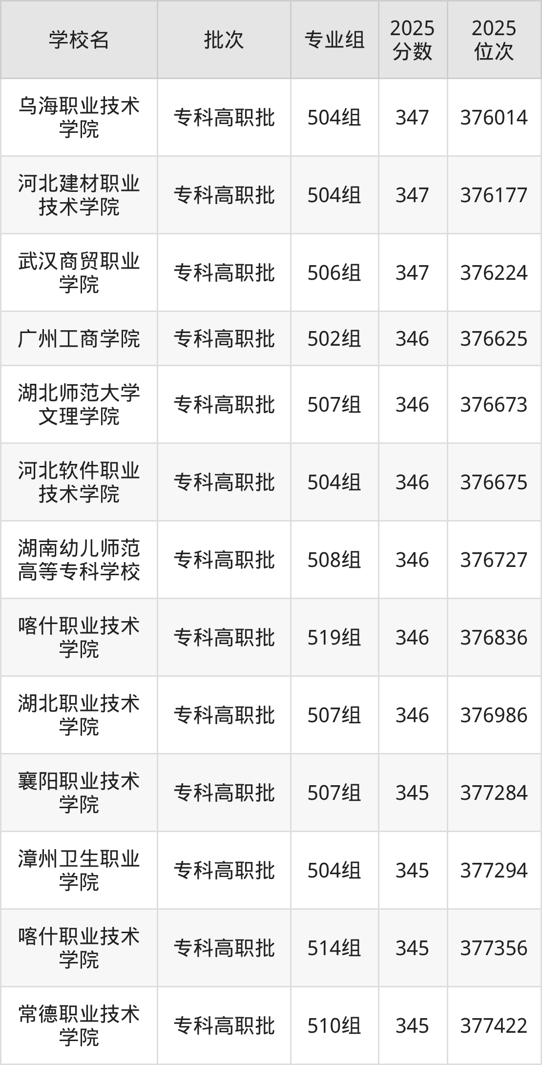 2025年广东高考物理类346分(376429名~377178名)能上的大学有湖北职业技术学院507组、河北软件职业技术学院504组、湖北师范大学文理学院507组、广州工商学院502组等。