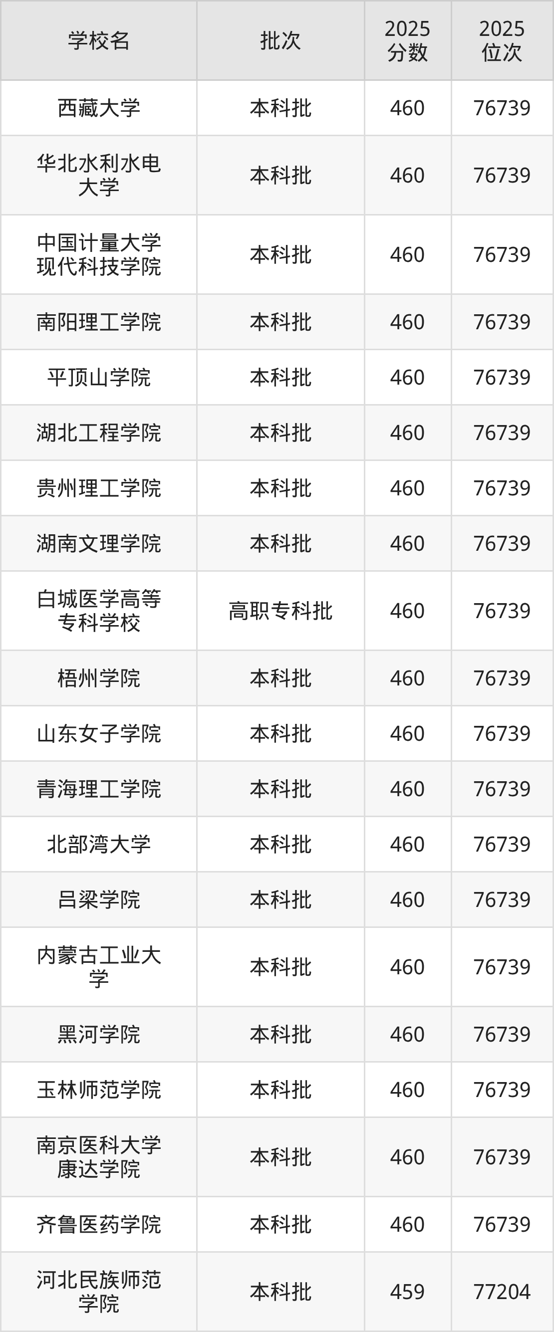 2025年辽宁高考物理类459分(76740名~77204名)能上的大学有茅台学院、吉林农业科技学院、广西师范大学、滇西应用技术大学等。