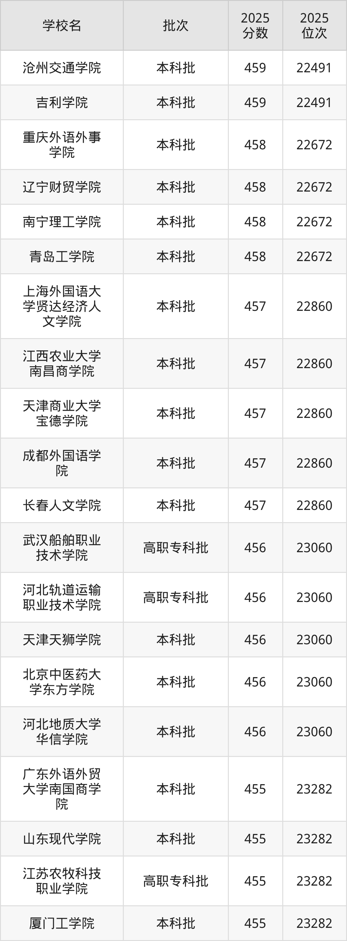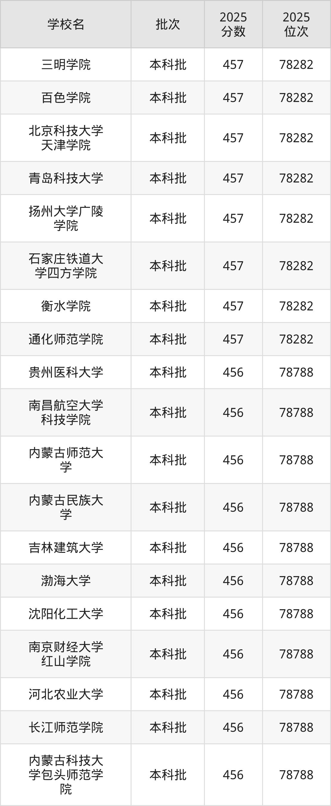 2025年辽宁高考物理类456分(78283名~78788名)能上的大学有渤海大学、南京财经大学红山学院、内蒙古科技大学包头师范学院、南昌航空大学科技学院等。