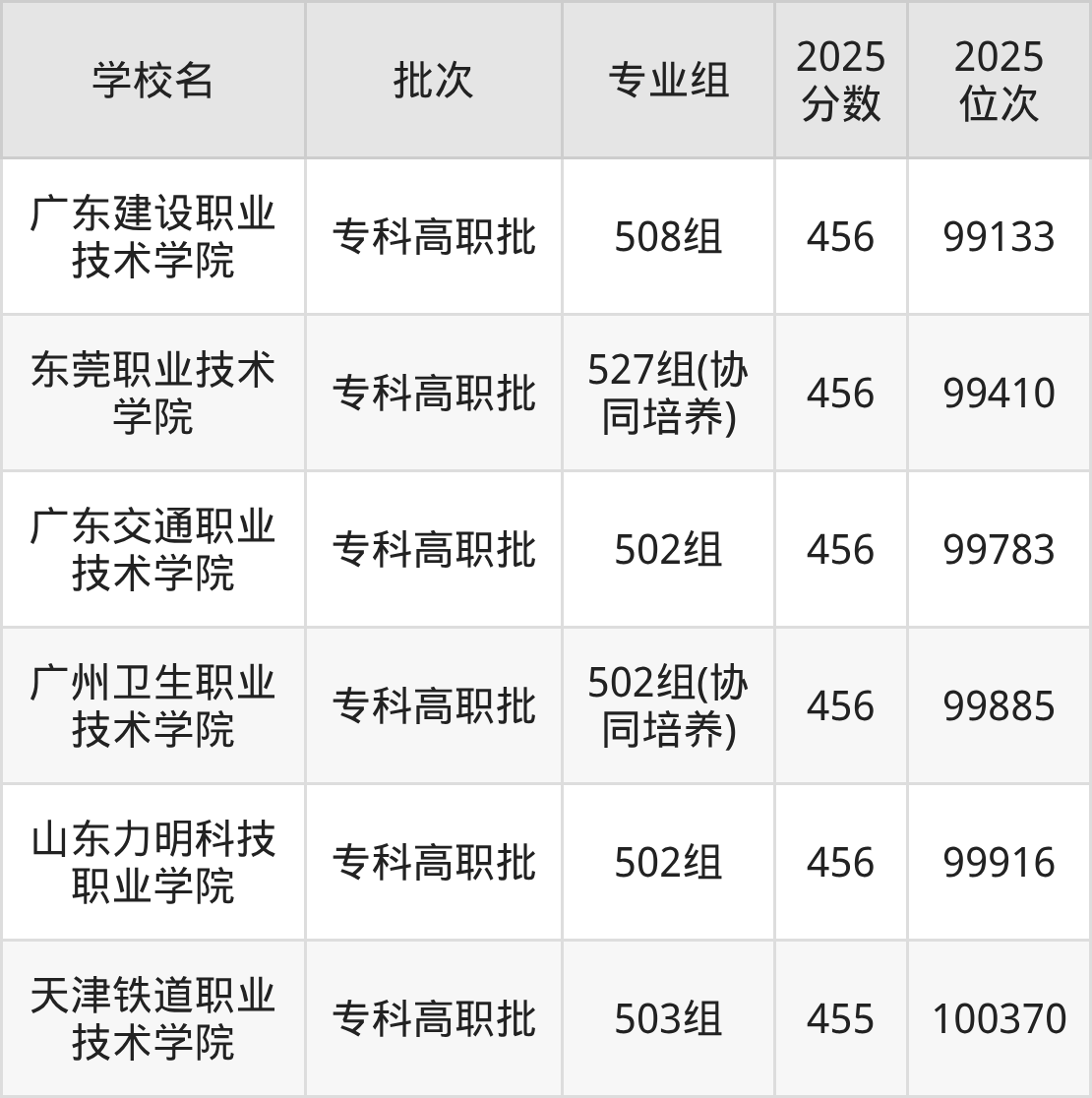 2025年广东高考历史类456分(98952名~99980名)能上的大学有广东交通职业技术学院502组、广东建设职业技术学院508组、山东力明科技职业学院502组、东莞职业技术学院527组(协同培养)等。