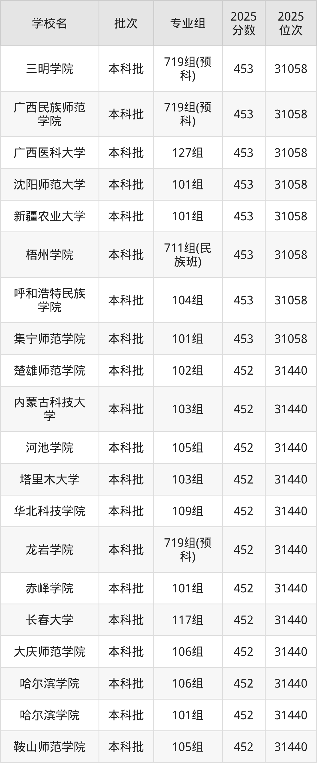 2025年广西高考历史类451分(31441名~31833名)能上的大学有忻州师范学院101组、桂林理工大学719组(预科)、右江民族医学院111组、百色学院115组等。