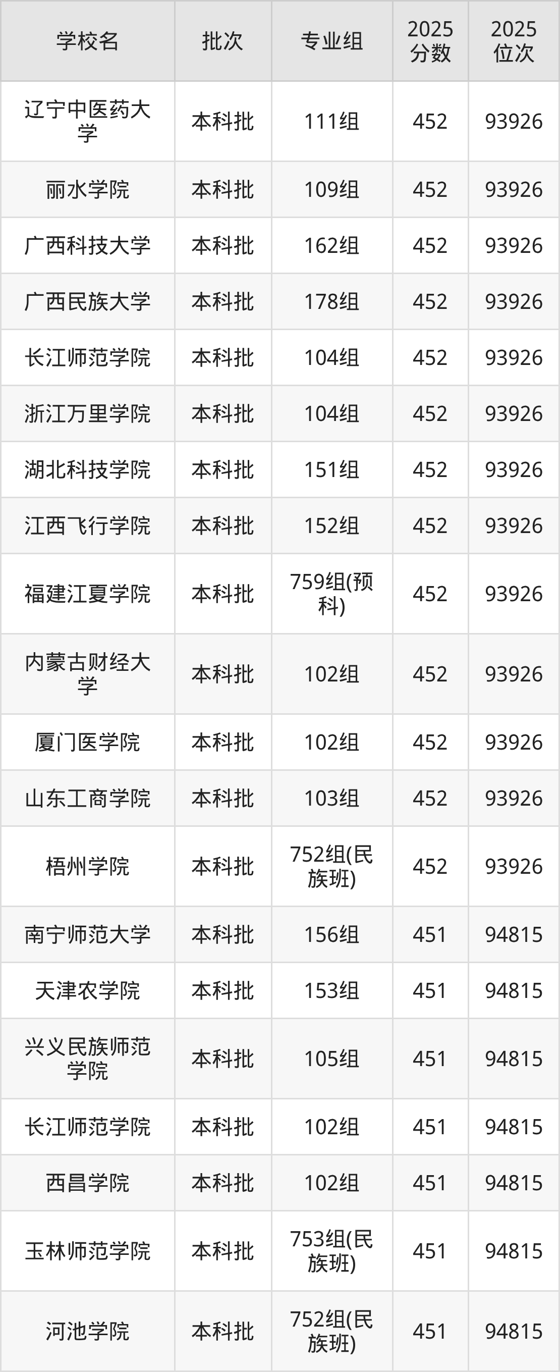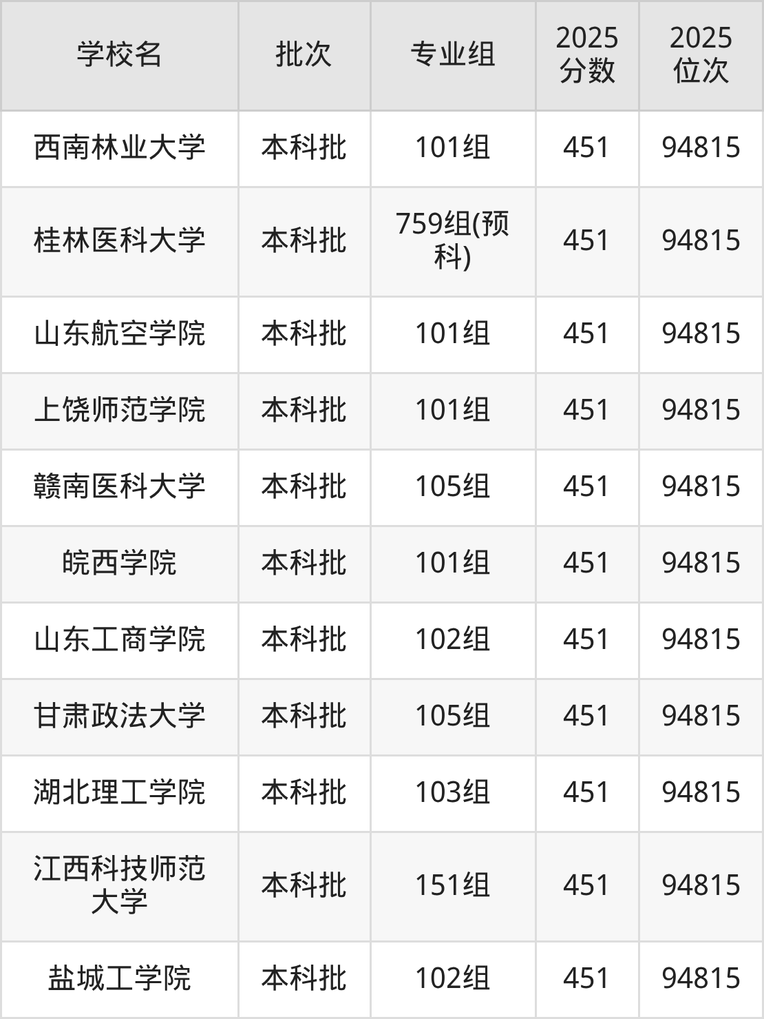 2025年广西高考物理类451分(93927名~94815名)能上的大学有天津农学院153组、盐城工学院102组、皖西学院101组、赣南医科大学105组等。