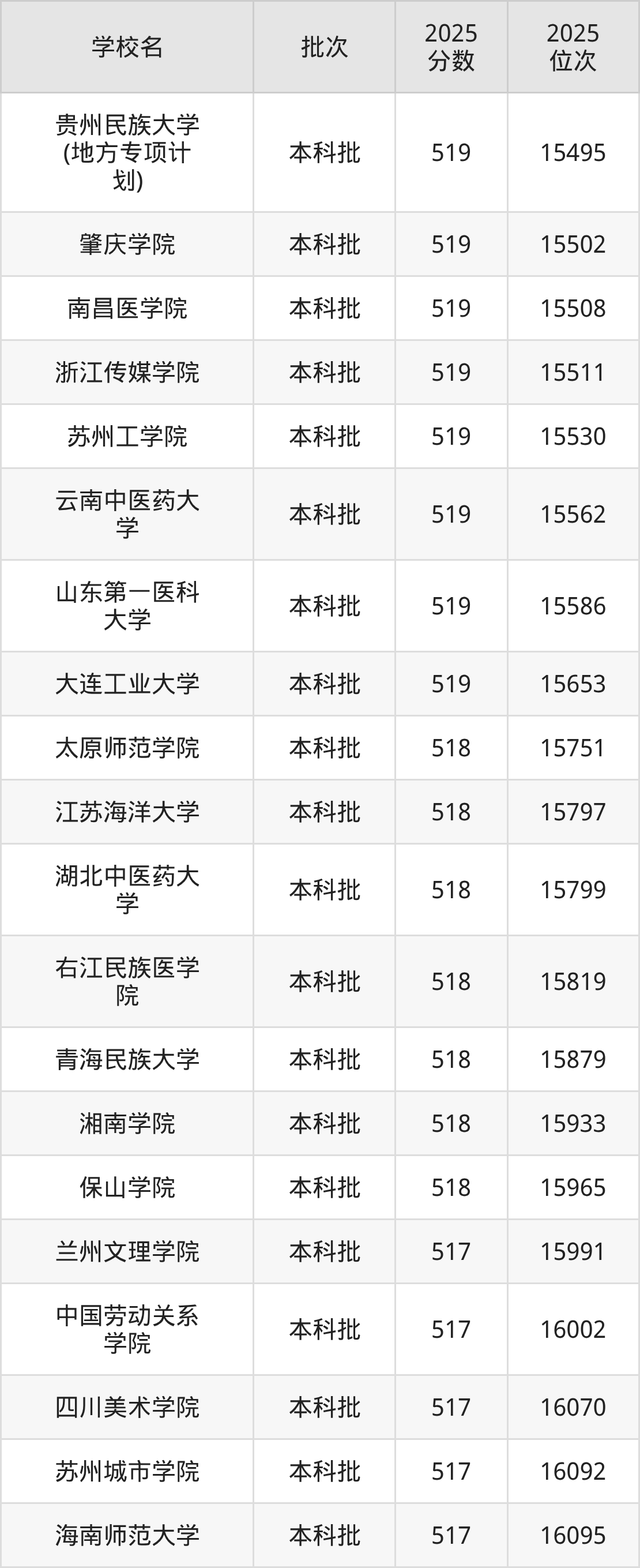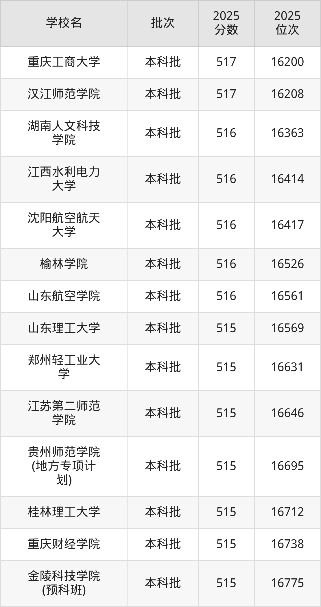 2025年贵州高考历史类517分(15991名~16289名)能上的大学有兰州文理学院、重庆工商大学、海南师范大学、四川美术学院等。