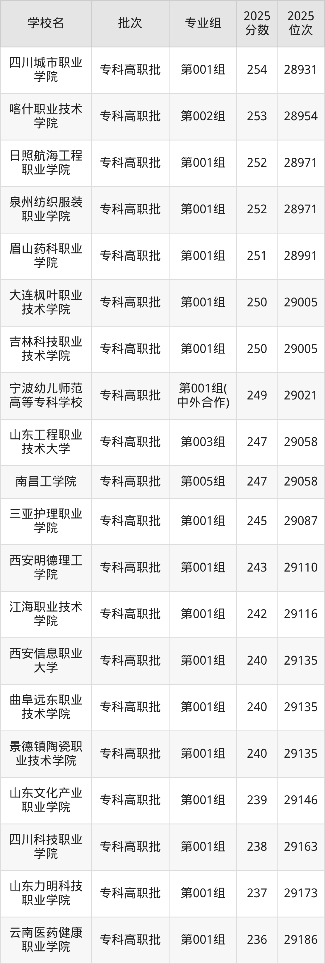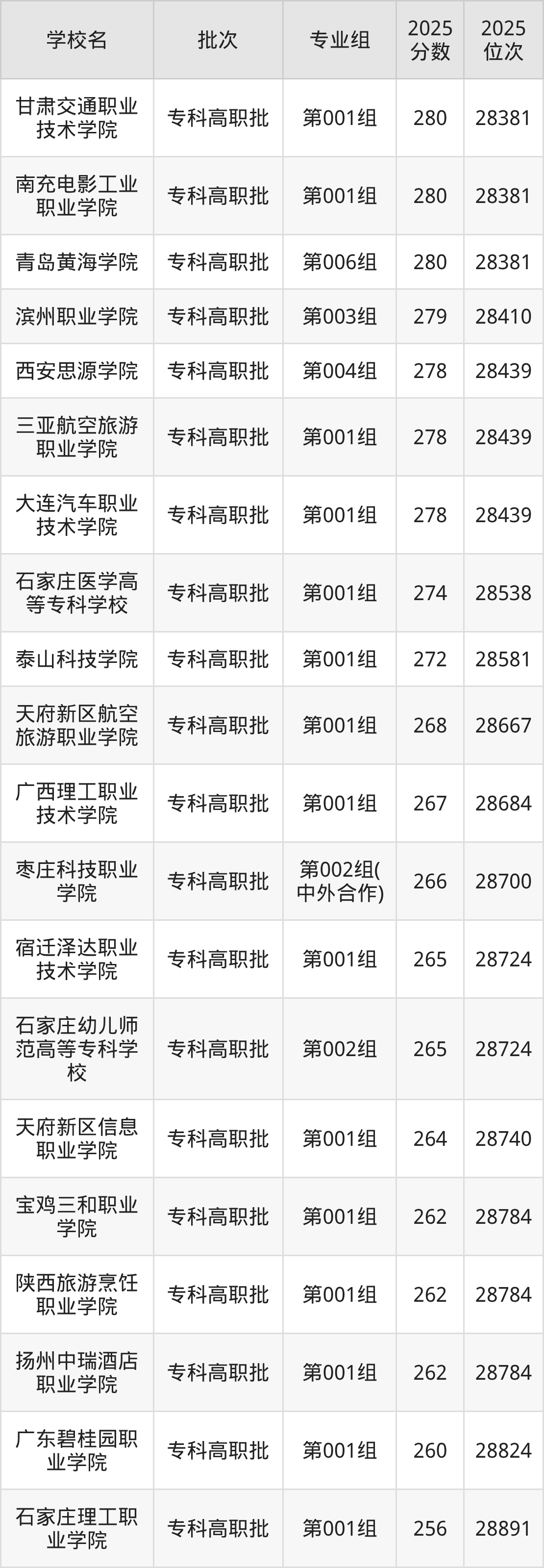 2025年吉林高考历史类258分(28851名~28861名)录取位次低于该区间(较稳妥)的有石家庄理工职业学院第001组(28891名)、四川城市职业学院第001组(28931名)等;录取位次高于该区间(可冲)的有广东碧桂园职业学院第001组(28824名)、扬州中瑞酒店职业学院第001组(28784名)等。