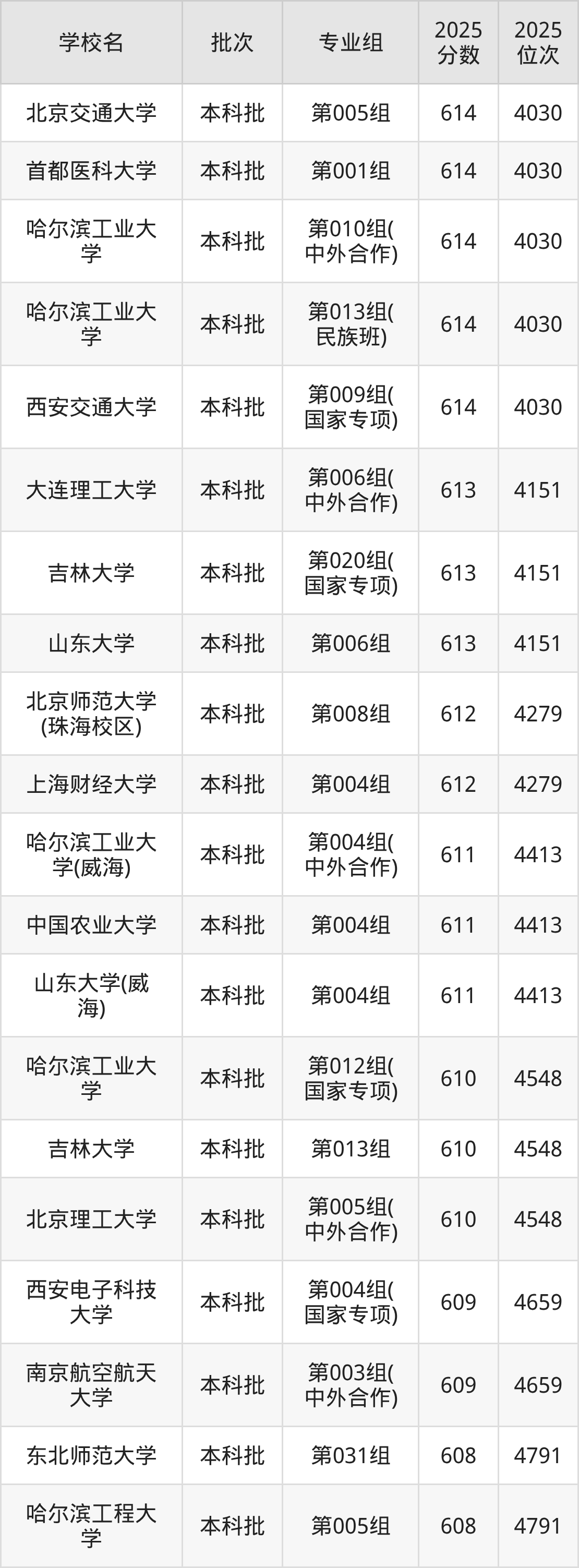 2025年黑龙江高考物理类610分(4414名~4548名)能上的大学有北京理工大学第005组(中外合作)、吉林大学第013组、哈尔滨工业大学第012组(国家专项)。