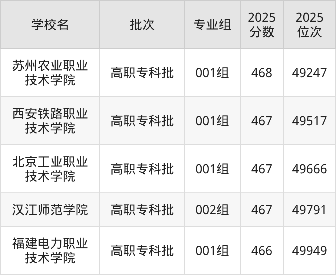2025年安徽高考历史类467分(49318名~49820名)能上的大学有北京工业职业技术学院001组、汉江师范学院002组、西安铁路职业技术学院001组。