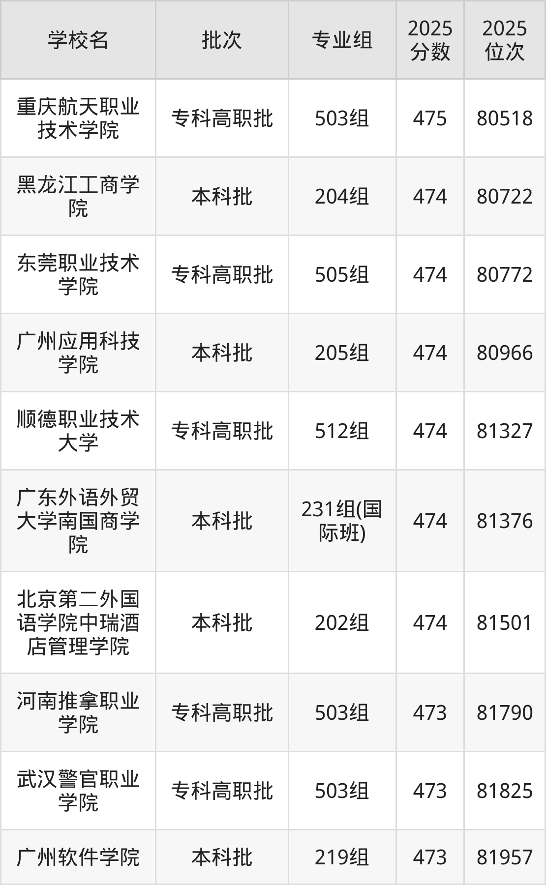 2025年广东高考历史类474分(80657名~81615名)能上的大学有广东外语外贸大学南国商学院231组(国际班)、黑龙江工商学院204组、广州应用科技学院205组、北京第二外国语学院中瑞酒店管理学院202组等。