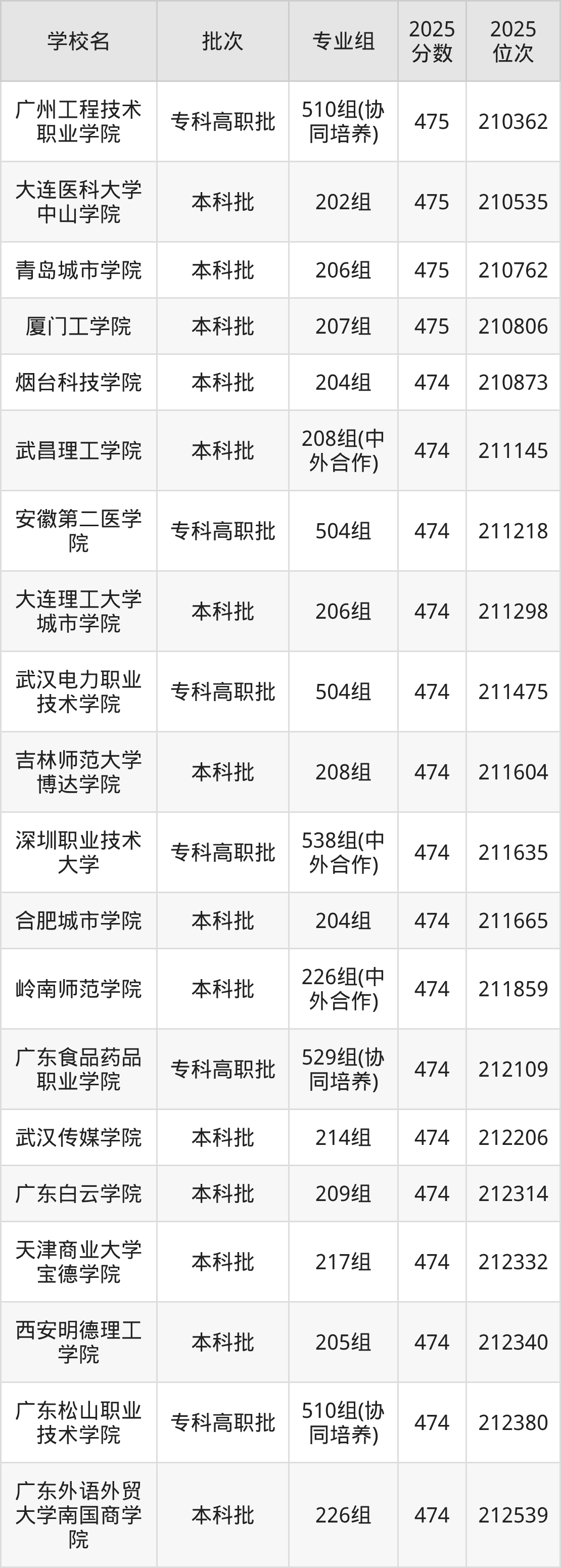 2025年广东高考物理类474分(210851名~212626名)能上的大学有岭南师范学院226组(中外合作)、广东白云学院209组、武昌理工学院208组(中外合作)、广州南方学院209组等。