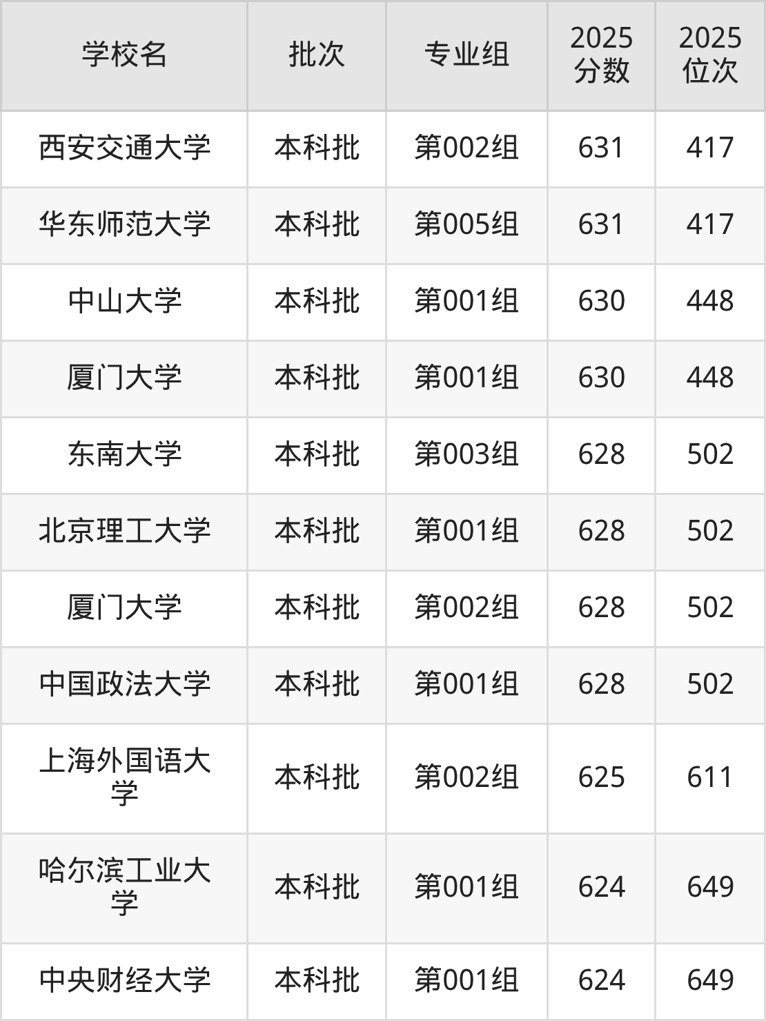 由于高考录取分数线历年波动较大,因此本文以该分数对应的位次排名为大家整理能上的大学名单。