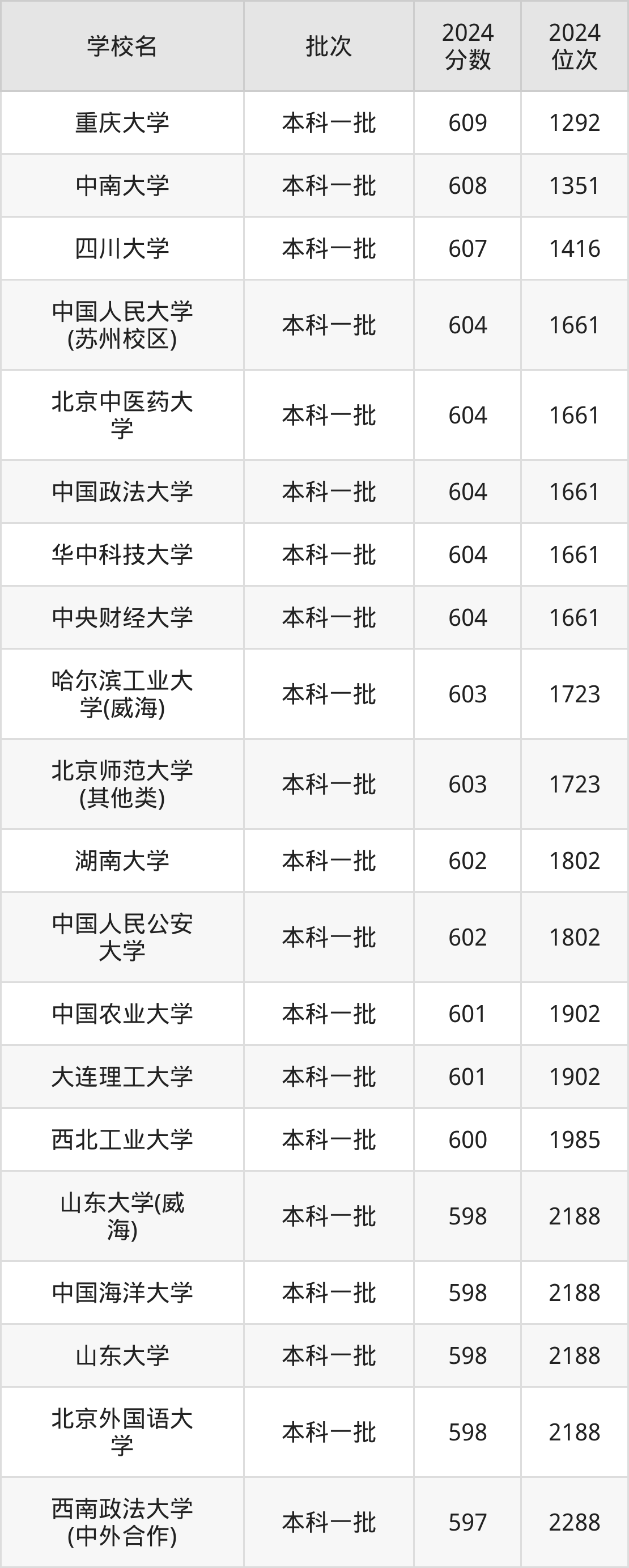 由于高考录取分数线历年波动较大,因此本文以该分数对应的位次排名为大家整理能上的大学名单。