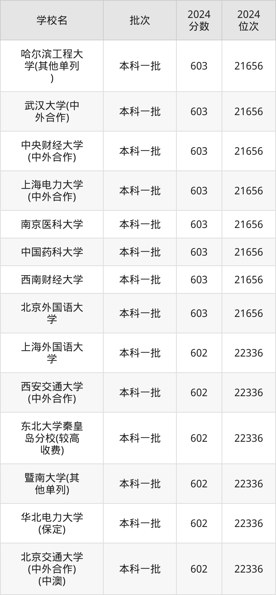 2024年河南高考理科602分(21657名~22336名)能上的大学有上海外国语大学、华北电力大学(保定)、暨南大学(其他单列)、东北大学秦皇岛分校(较高收费)等。