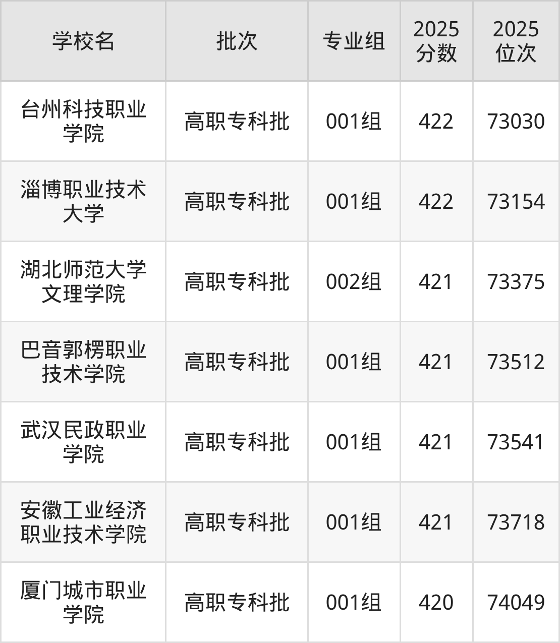 2025年安徽高考历史类421分(73225名~73753名)能上的大学有巴音郭楞职业技术学院001组、武汉民政职业学院001组、湖北师范大学文理学院002组、安徽工业经济职业技术学院001组。